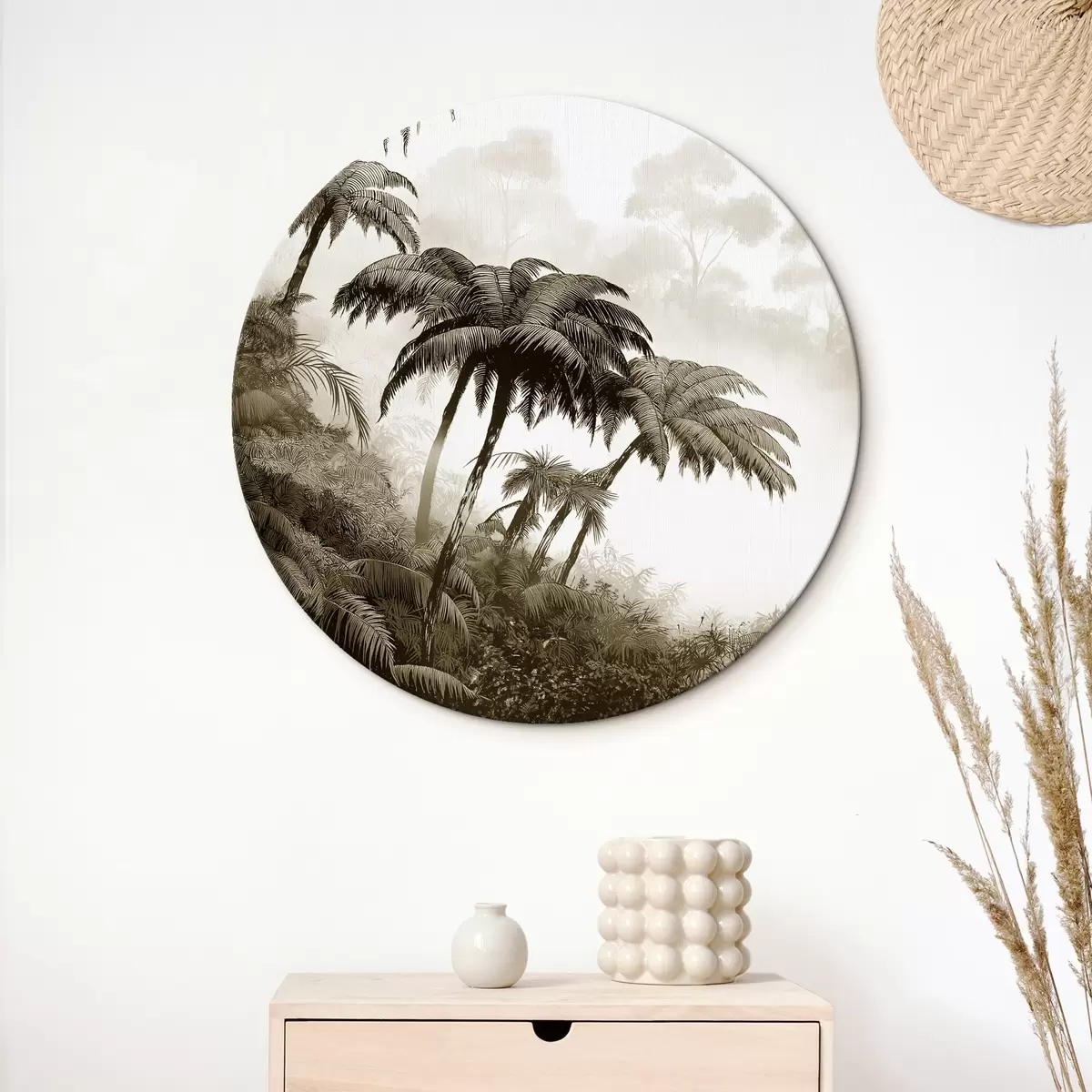 Okrągły obraz Las dżungli we mgle, palmy, natura, beżowe kolory Nr r42372