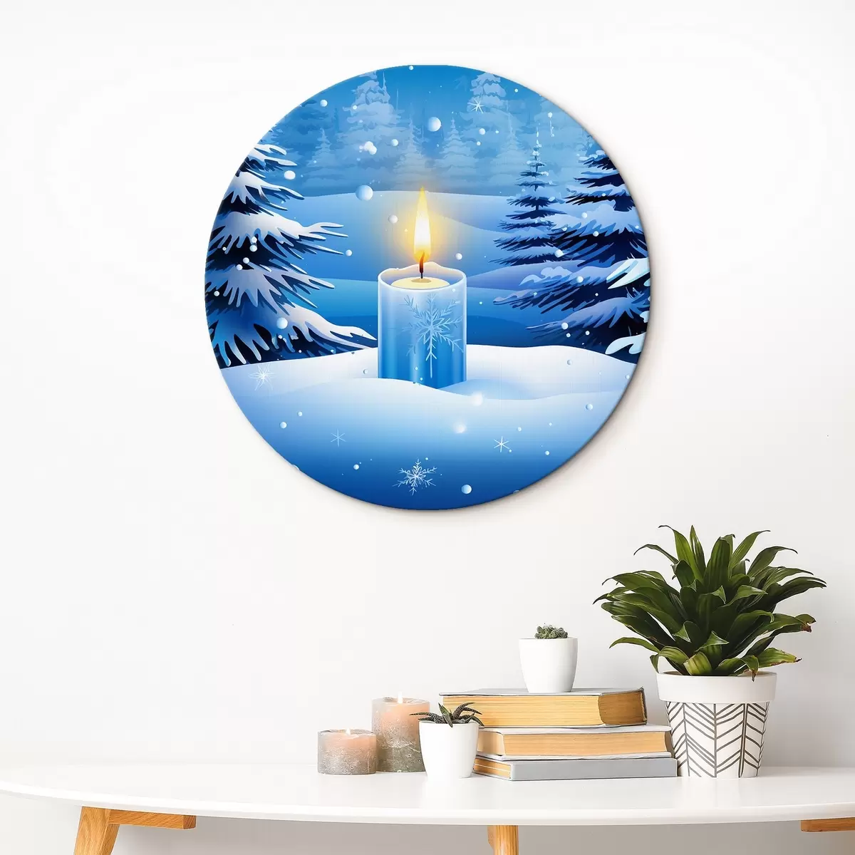Okrągły obraz Świeca na tle zimowego zaśnieżonego lasu Nr r42383