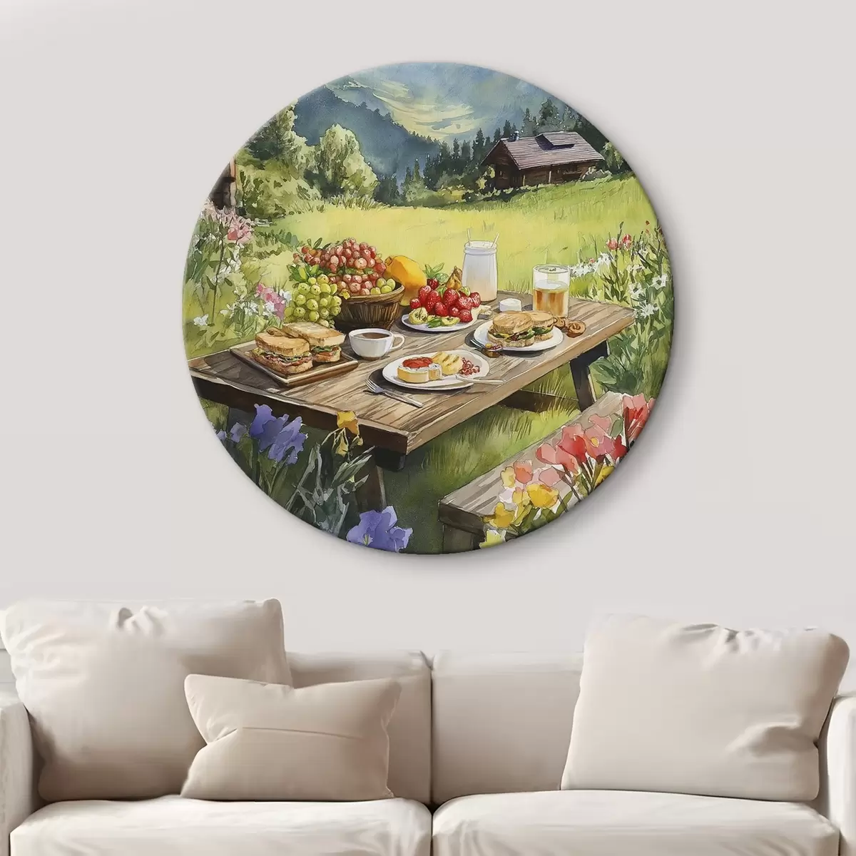 Okrągły obraz Górskie krajobrazy, letnia łąka, drewniane domy, śniadanie Nr r42425