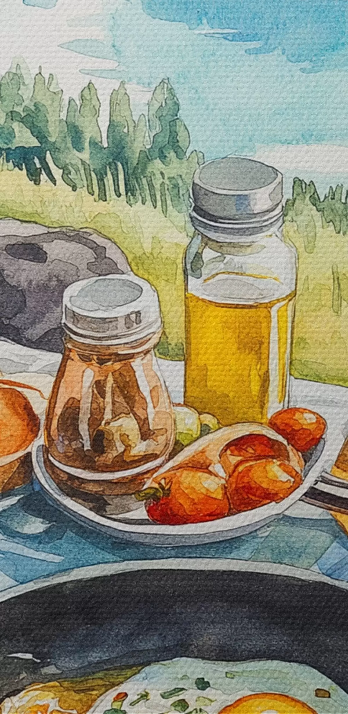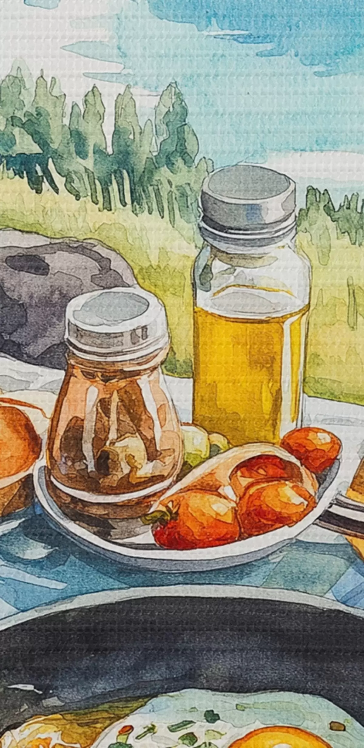 Okrągłe obrazy Estetyczne śniadanie w pobliżu jeziora, styl akwareli r42432