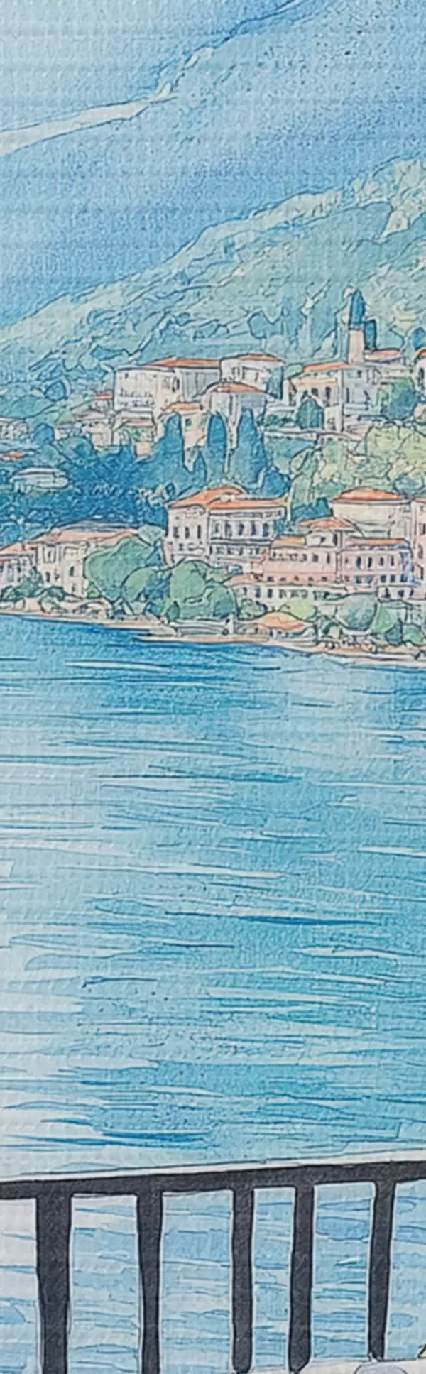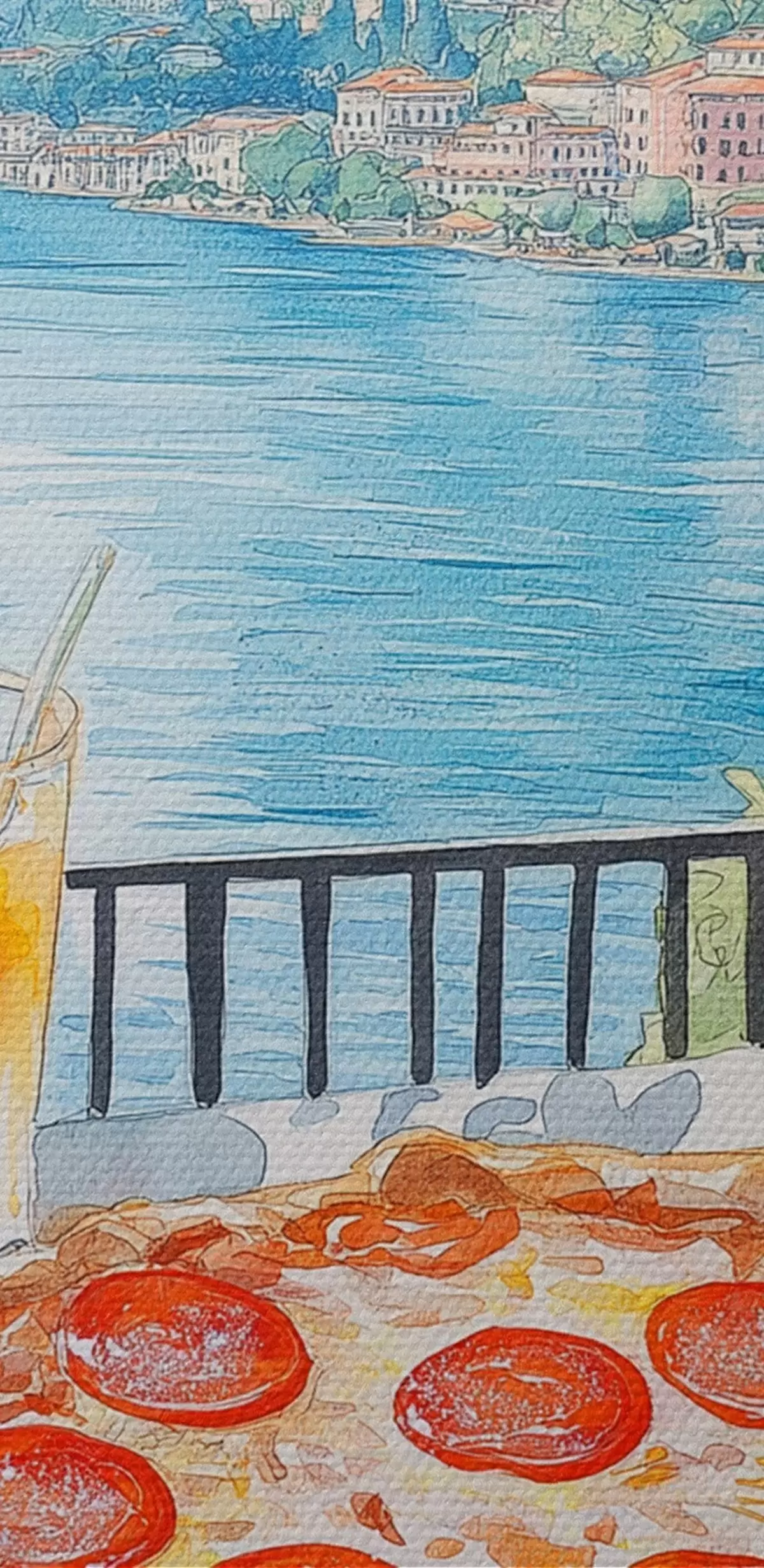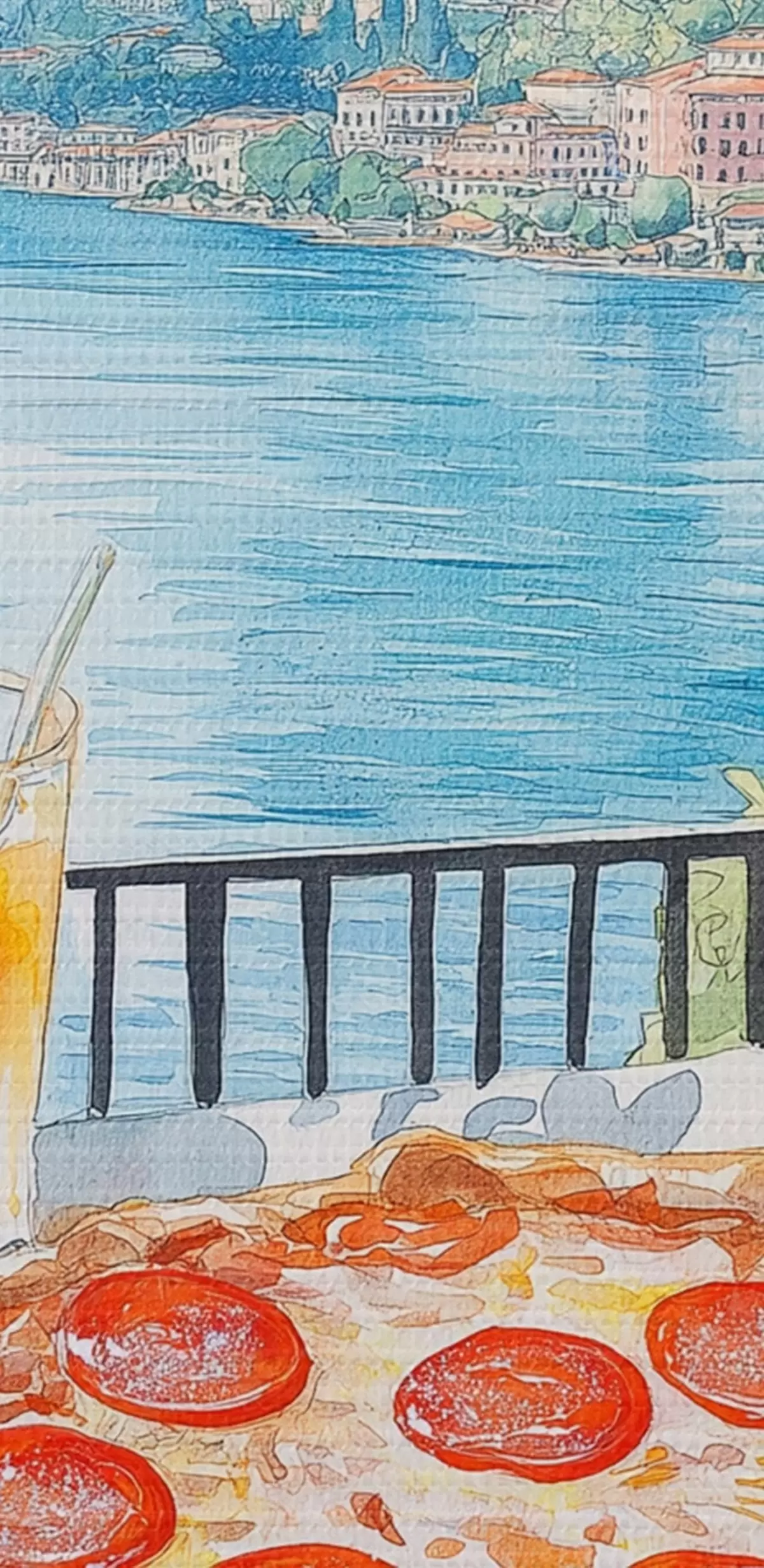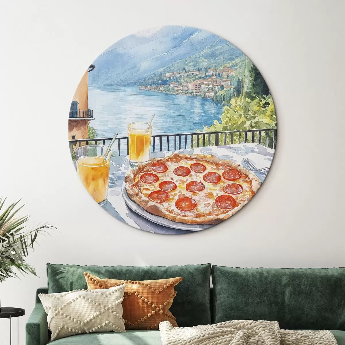 Okrągły obraz Brunch we Włoszech, styl akwareli, pizza margarita, jezioro, letnia przyroda Nr r42436