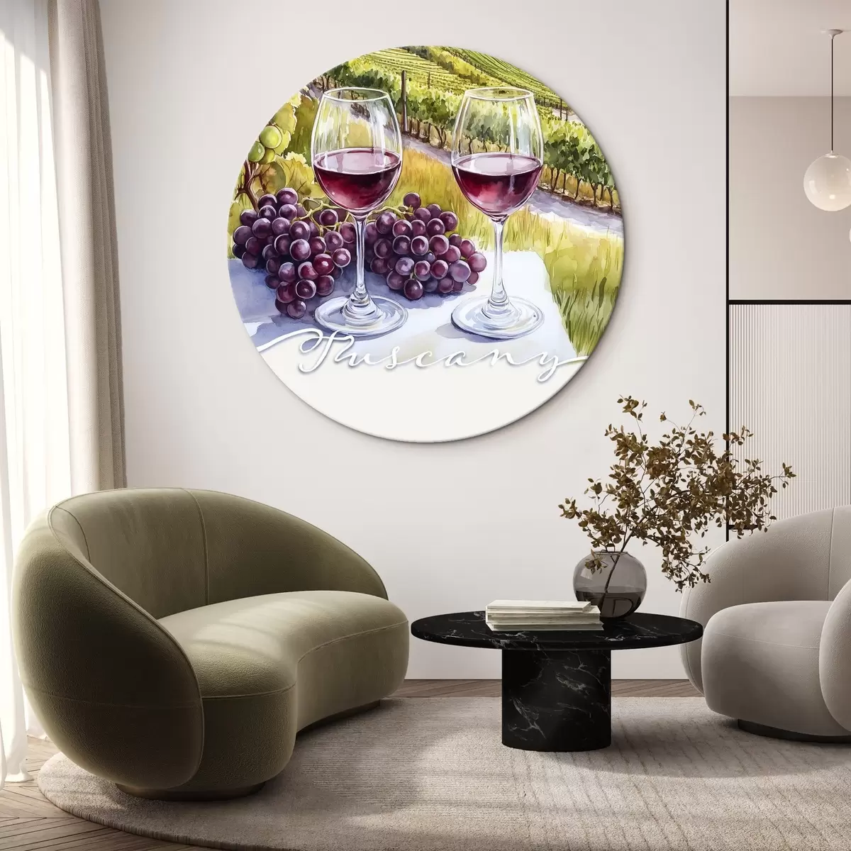 Okrągłe obrazy Toskańskie krajobrazy, styl akwareli, kieliszki do wina, winogrona, zachód słońca r42439