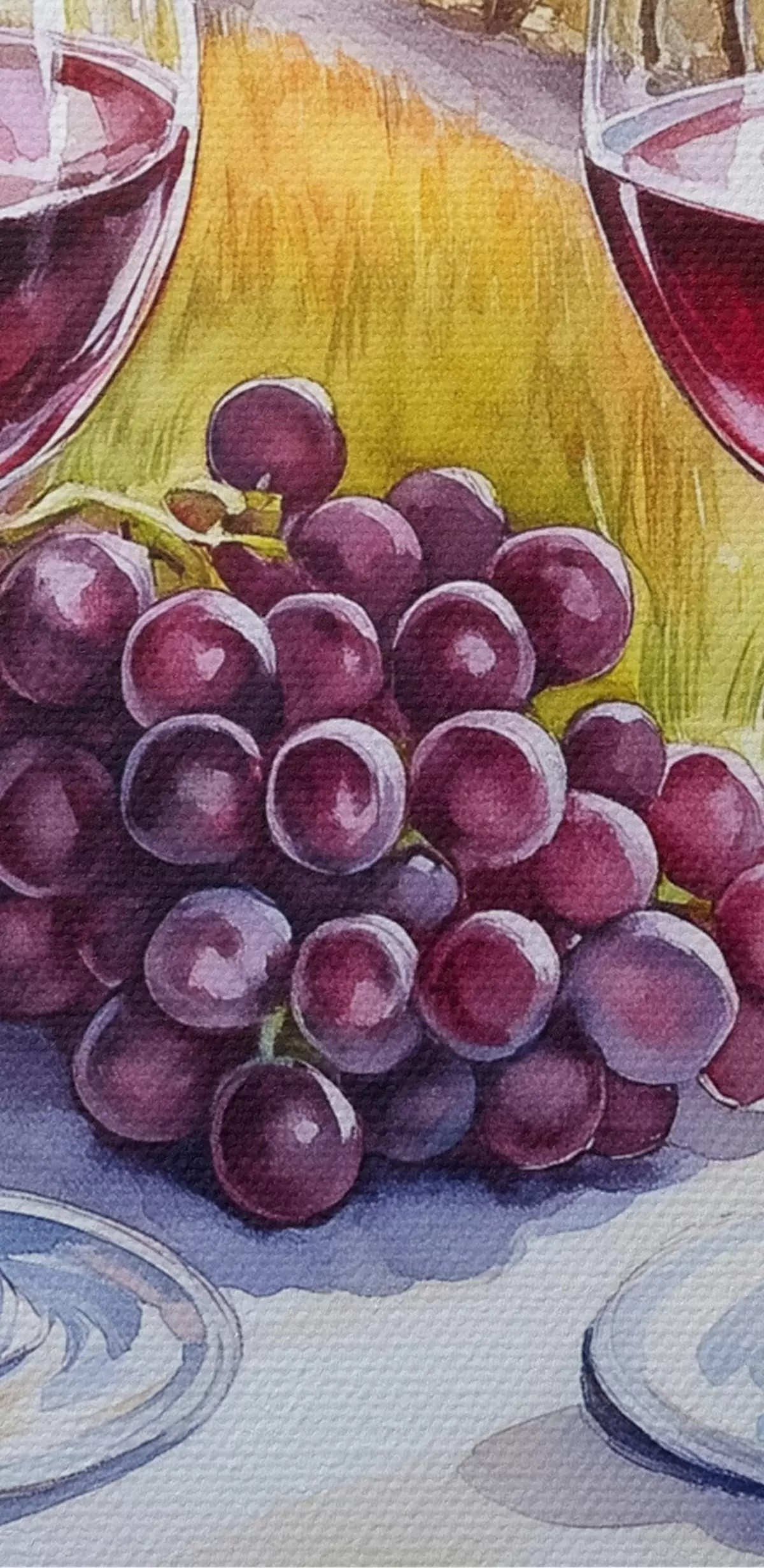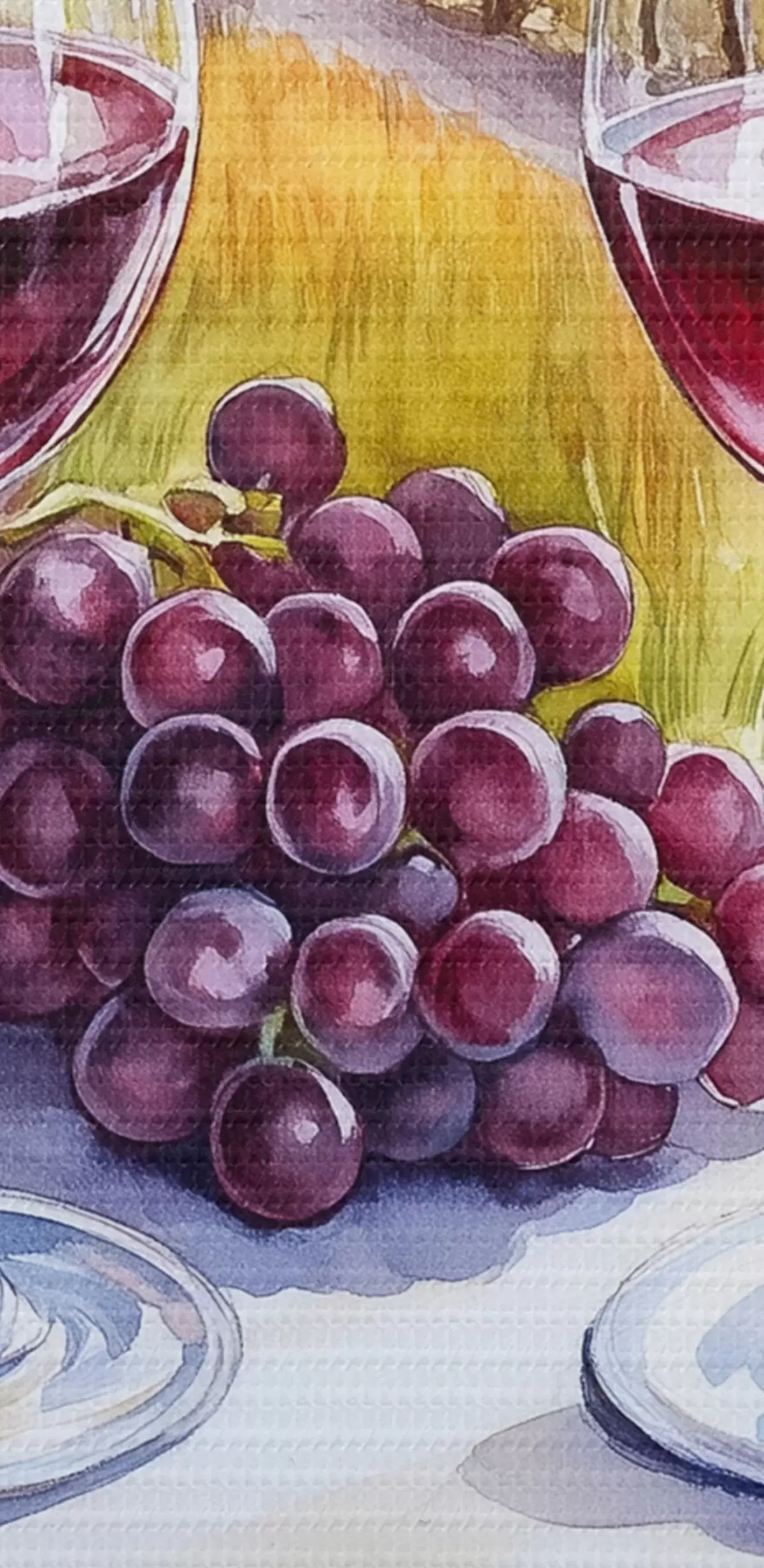 Okrągły obraz Toskańskie krajobrazy, styl akwareli, kieliszki do wina, winogrona, zachód słońca Nr r42439