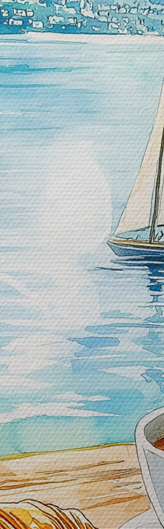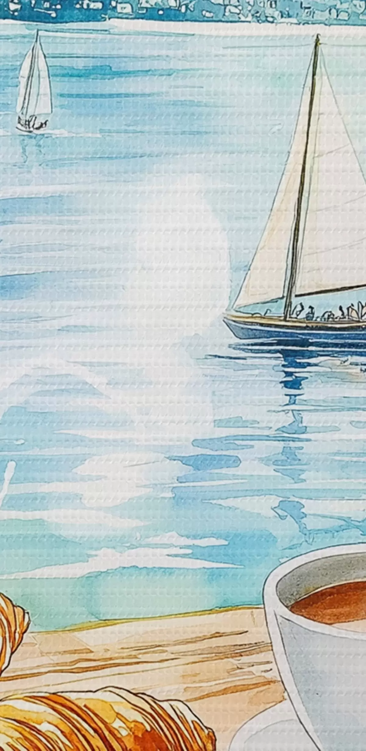 Okrągły obraz Letnie jezioro z żaglówkami, filiżankami kawy, rogalikami, styl akwareli Nr r42441