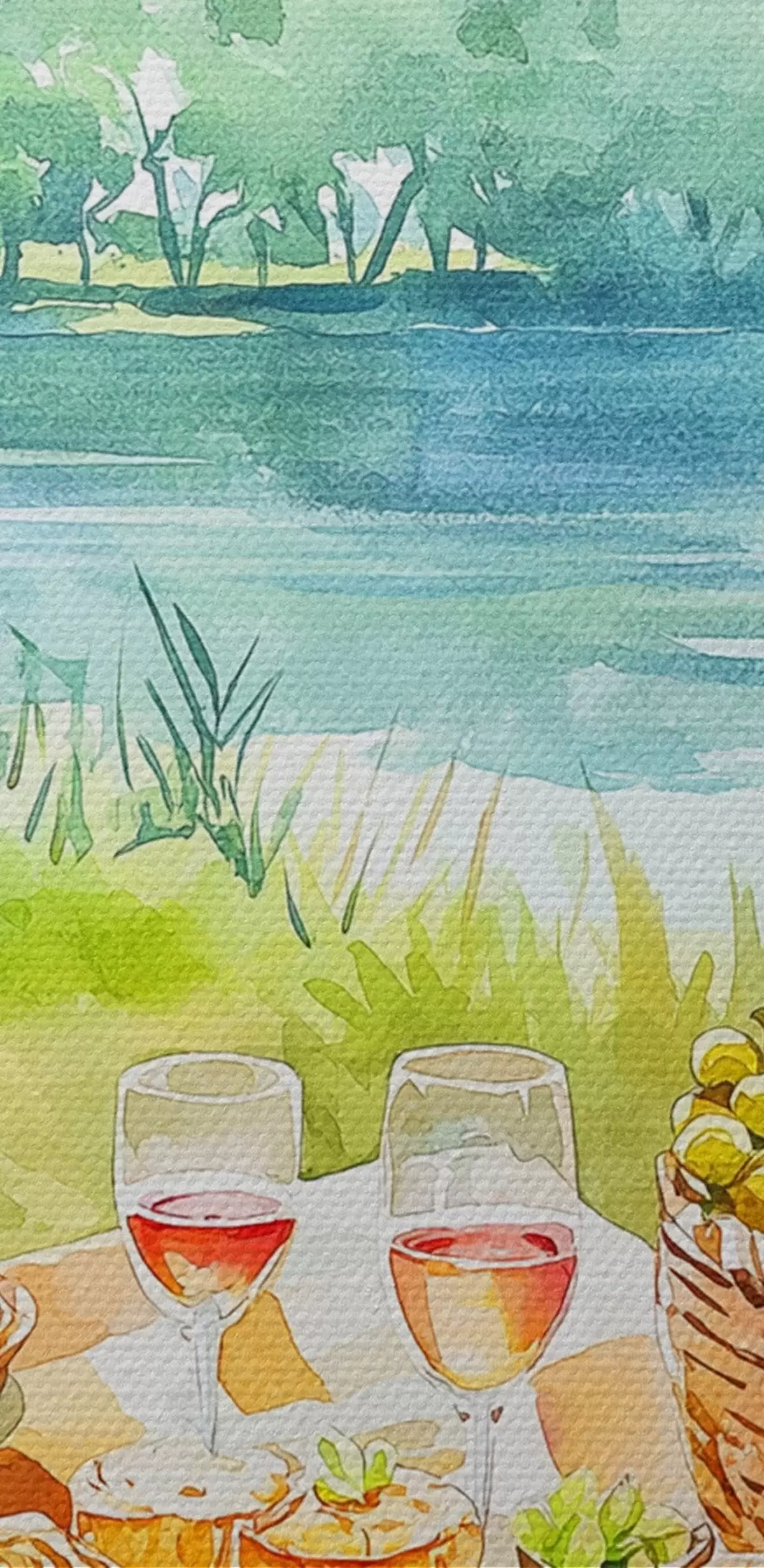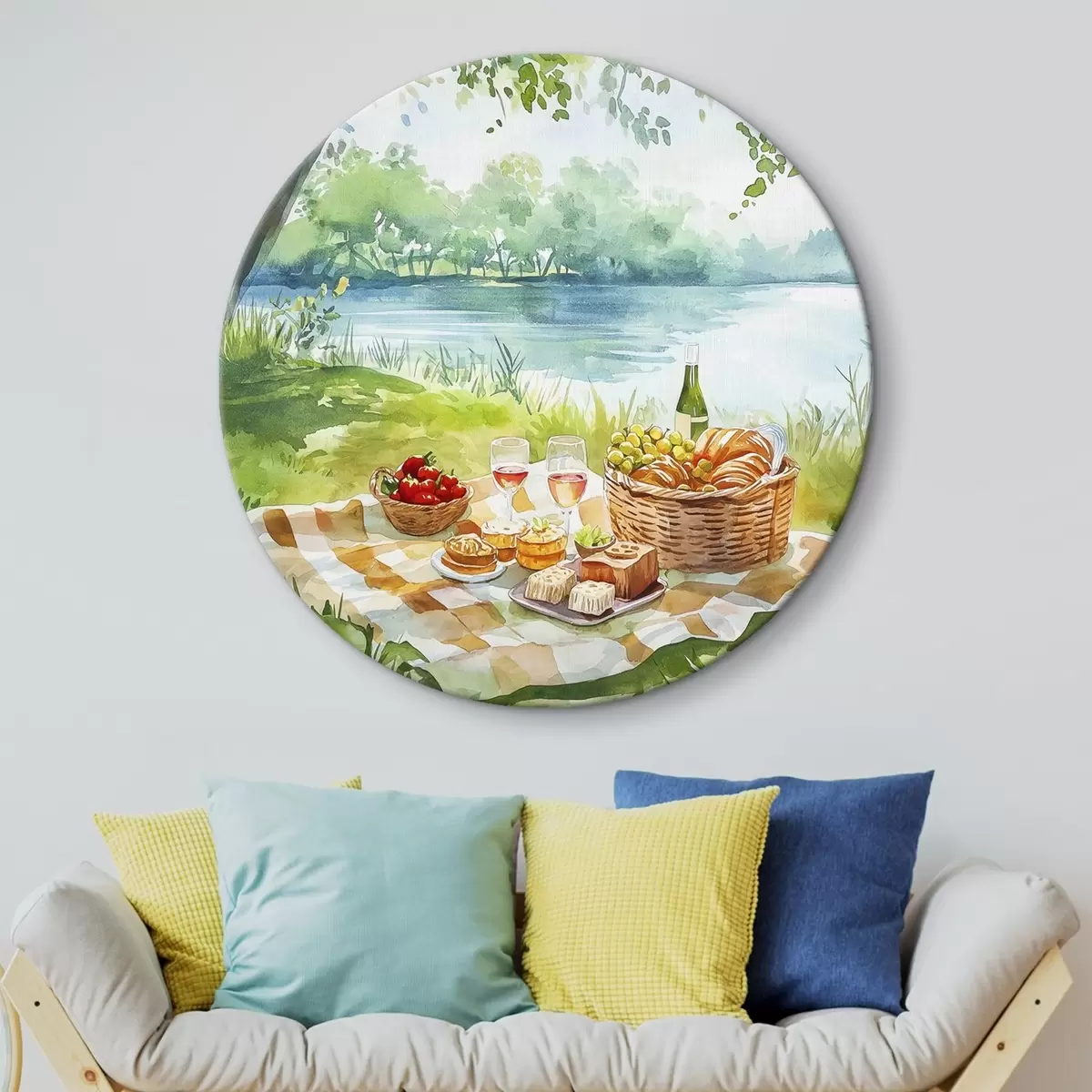 Okrągły obraz Estetyka pikniku, letnia przyroda, jezioro, romantyczny, styl akwareli Nr r42450