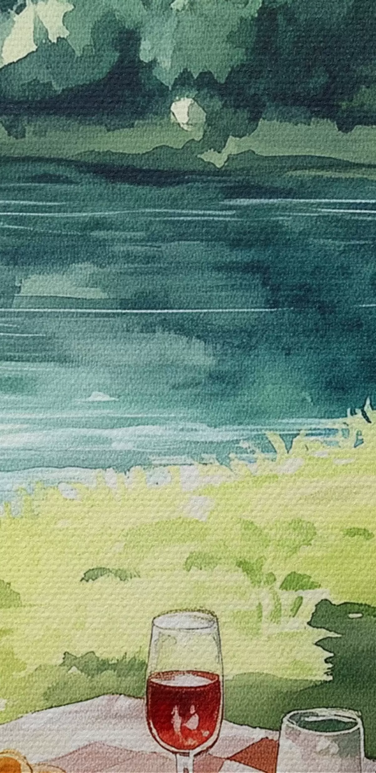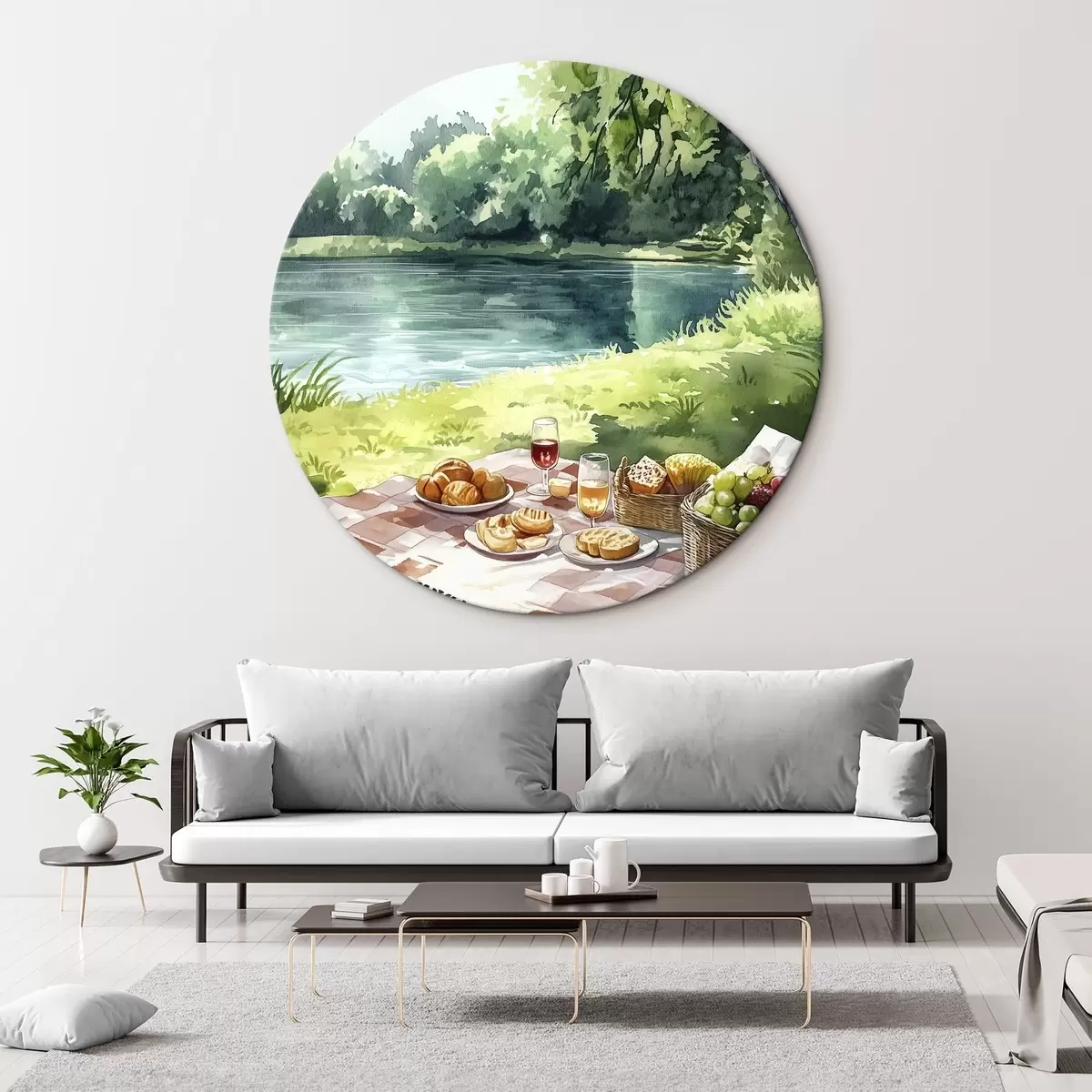 Okrągłe obrazy Piękny romantyczny piknik nad letnim jeziorem, owoce, zieleń r42451