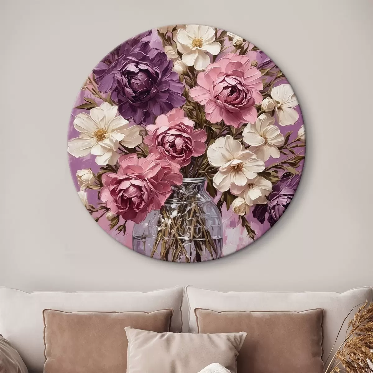 Okrągły obraz Kwiaty w przezroczystym wazonie na fioletowym tle Nr r42535