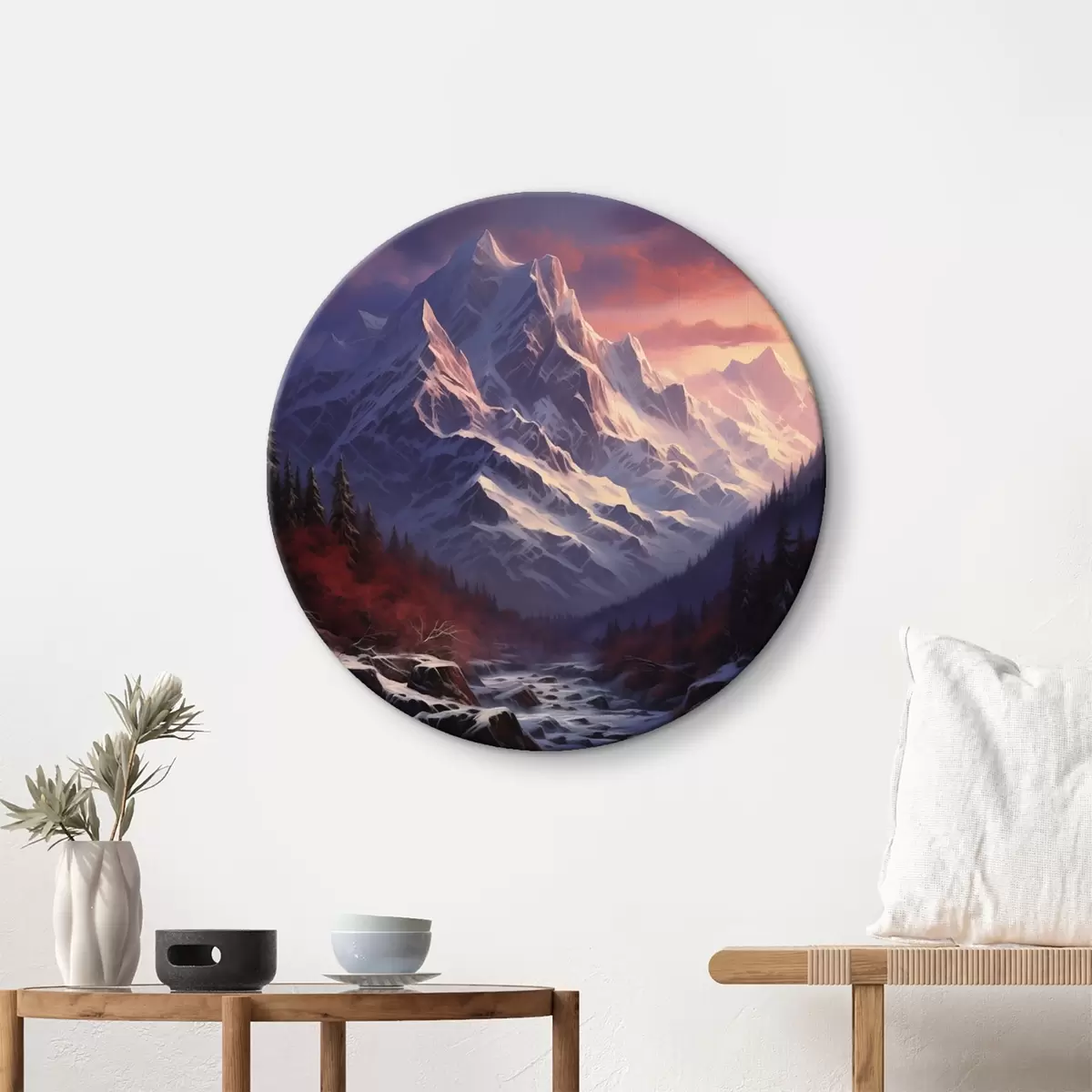 Okrągły obraz Zapierający dech w piersiach górski krajobraz o zachodzie słońca z ośnieżonymi szczytami, ciemnymi sosnami i delikatnymi różowo-fioletowymi odcieniami na niebie Nr r42566