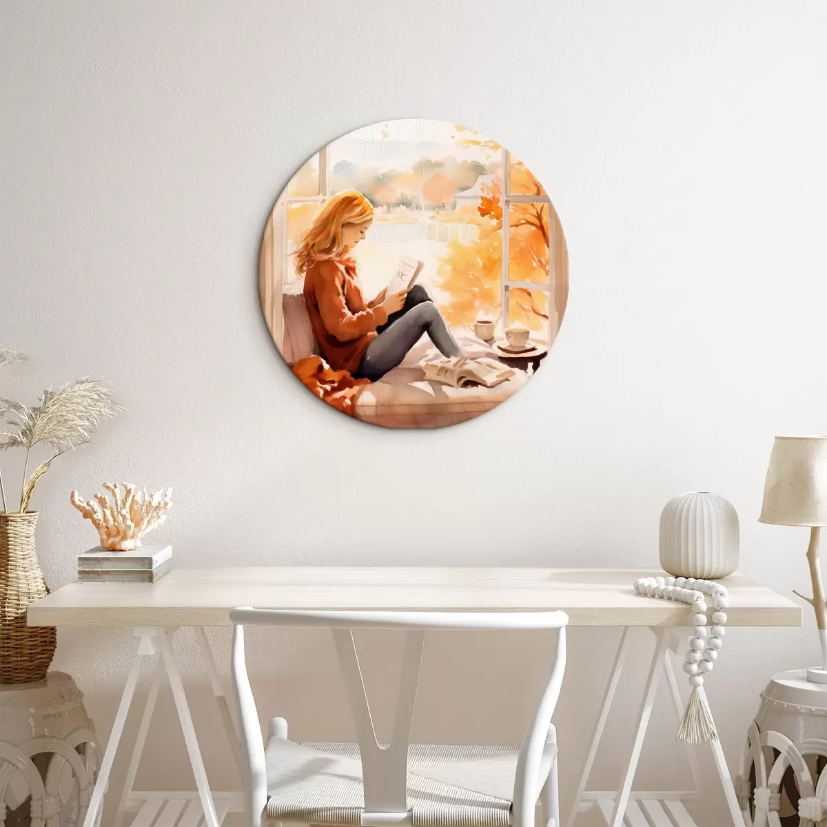 Okrągły obraz Dziewczyna czytająca książkę przy otwartym oknie w jesiennej scenerii, z jasnymi drzewами w tle i filiżanką herbaty w pobliżu Nr r42572