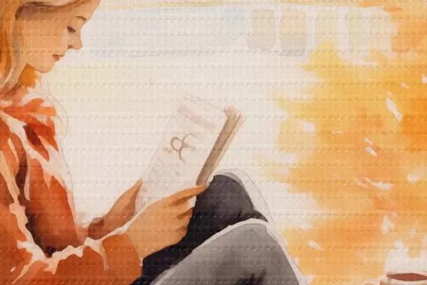 Okrągłe obrazy Dziewczyna czytająca książkę przy otwartym oknie w jesiennej scenerii, z jasnymi złotymi drzewami w tle i filiżanką herbaty w pobliżu. r42572