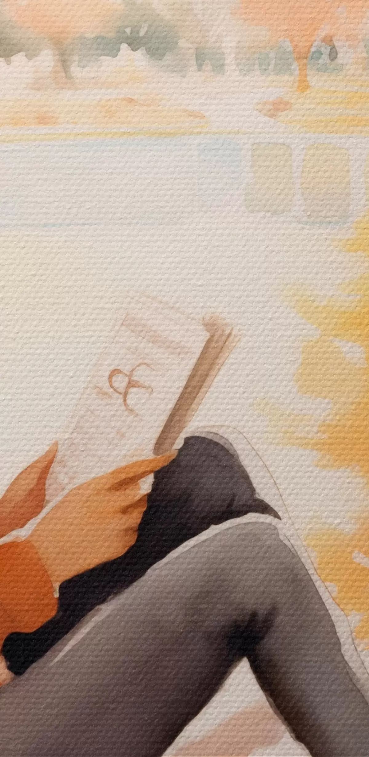 Okrągły obraz Dziewczyna czytająca książkę przy otwartym oknie w jesiennej scenerii, z jasnymi drzewами w tle i filiżanką herbaty w pobliżu. Nr r42572