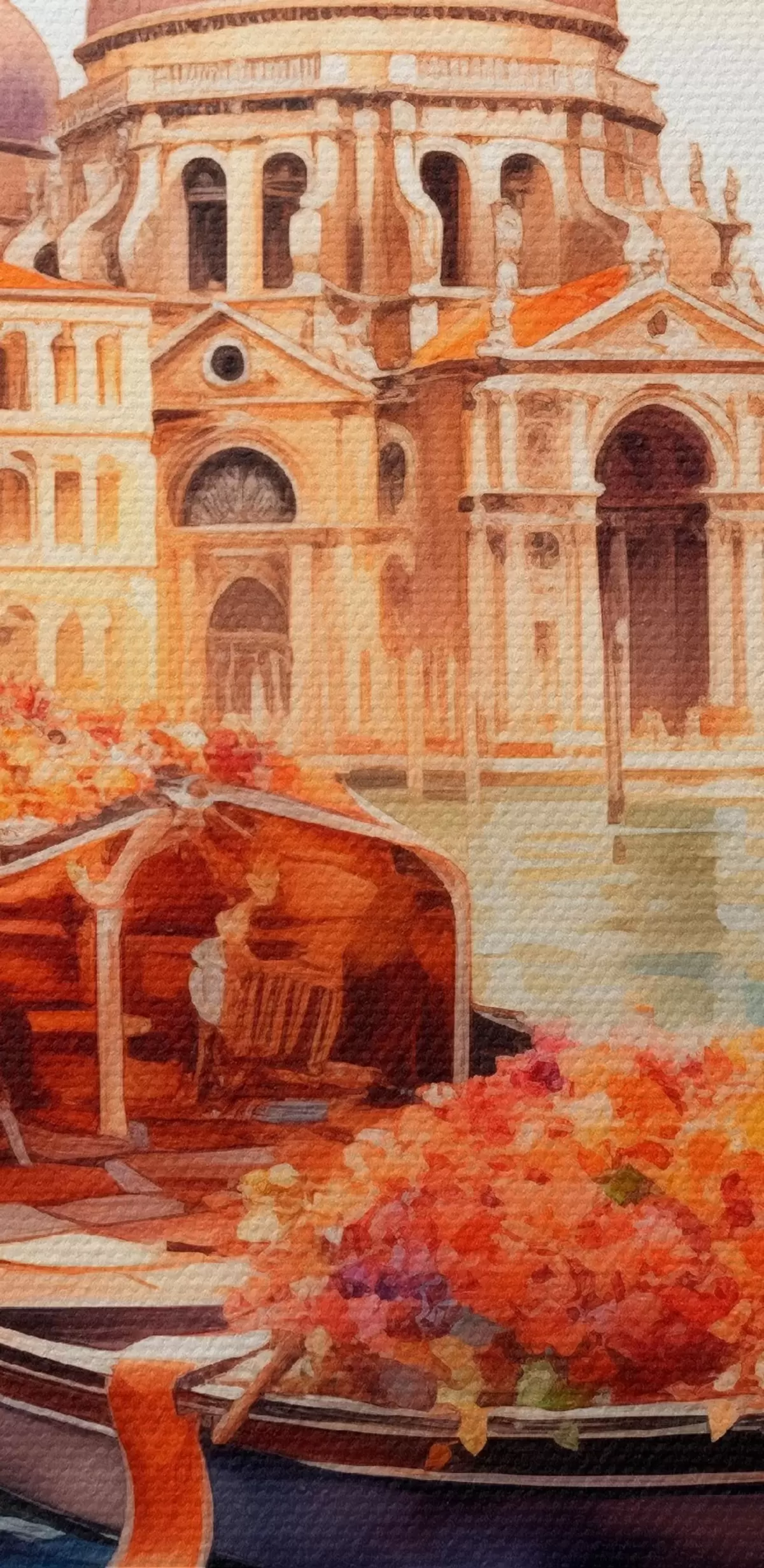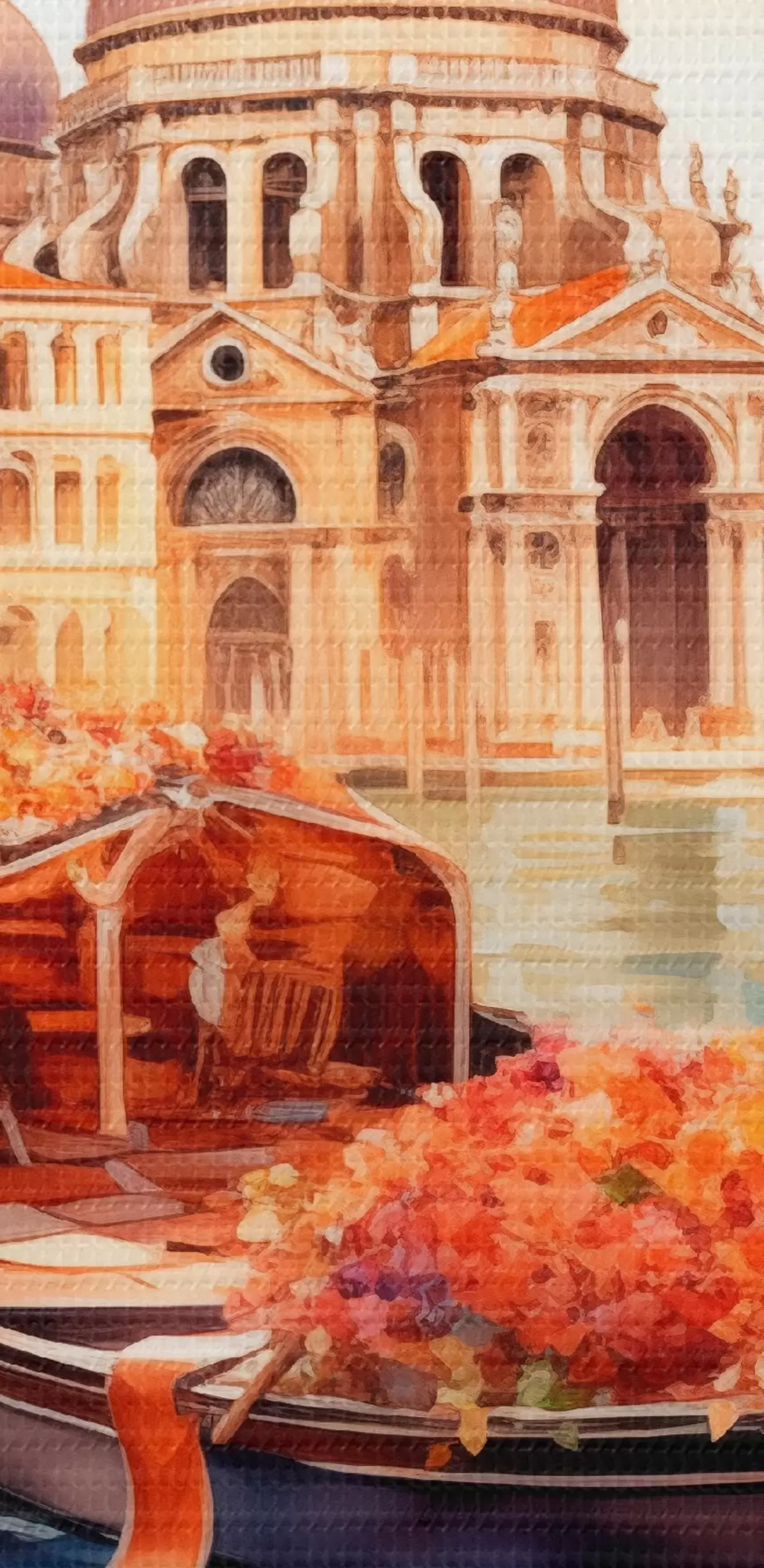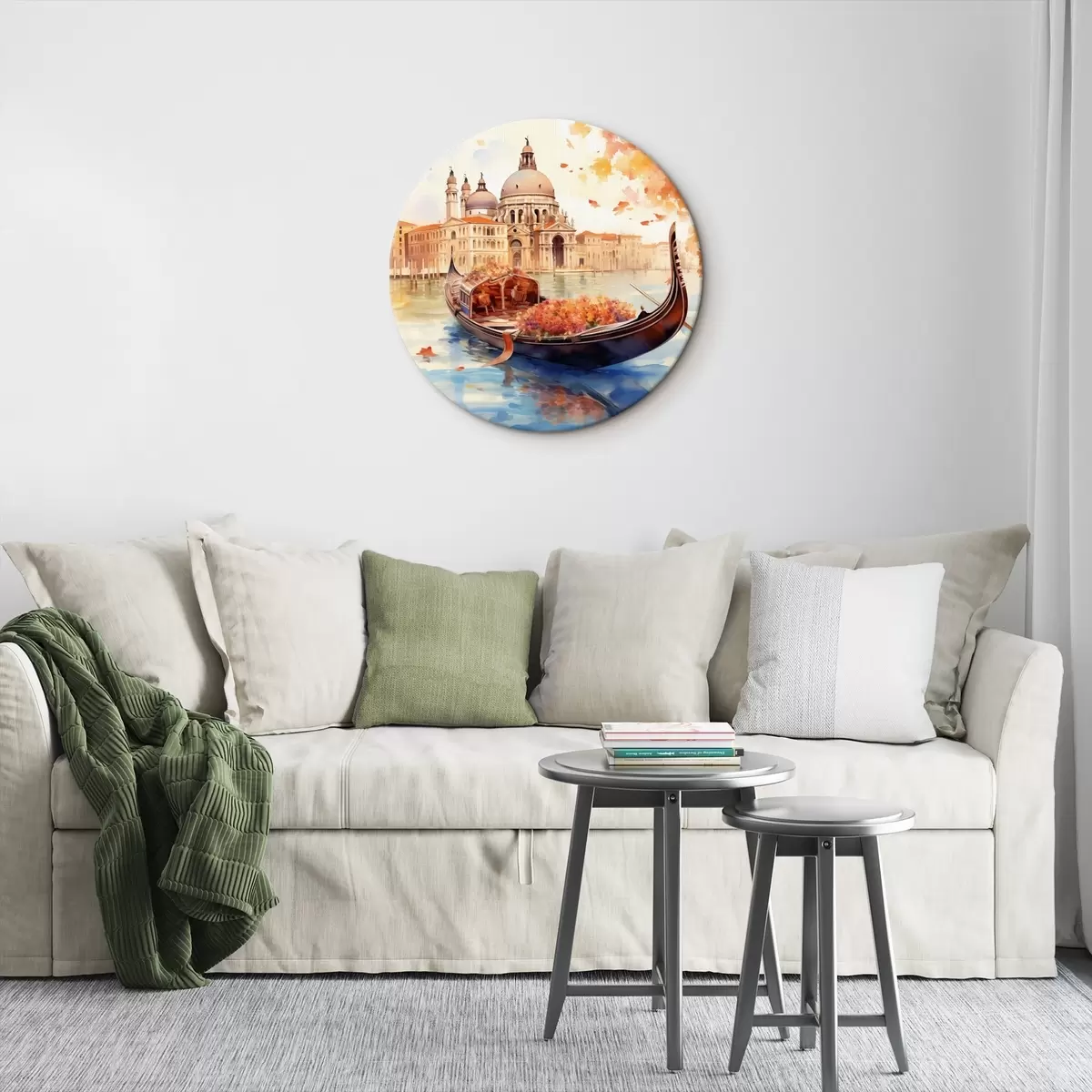 Okrągły obraz Jesienny widok na Wenecję z gondolą otoczoną jaskrawymi pomarańczowymi i czerwonymi liśćmi, z odbiciami budynków w spokojnej wodzie kanału Nr r42576