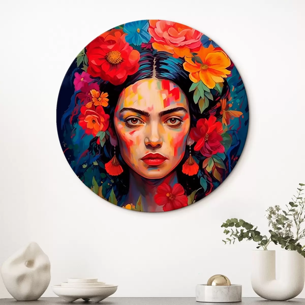 Okrągły obraz Portret kobiety z kwiatową ramką w jasnym abstrakcyjnym stylu Nr r42653