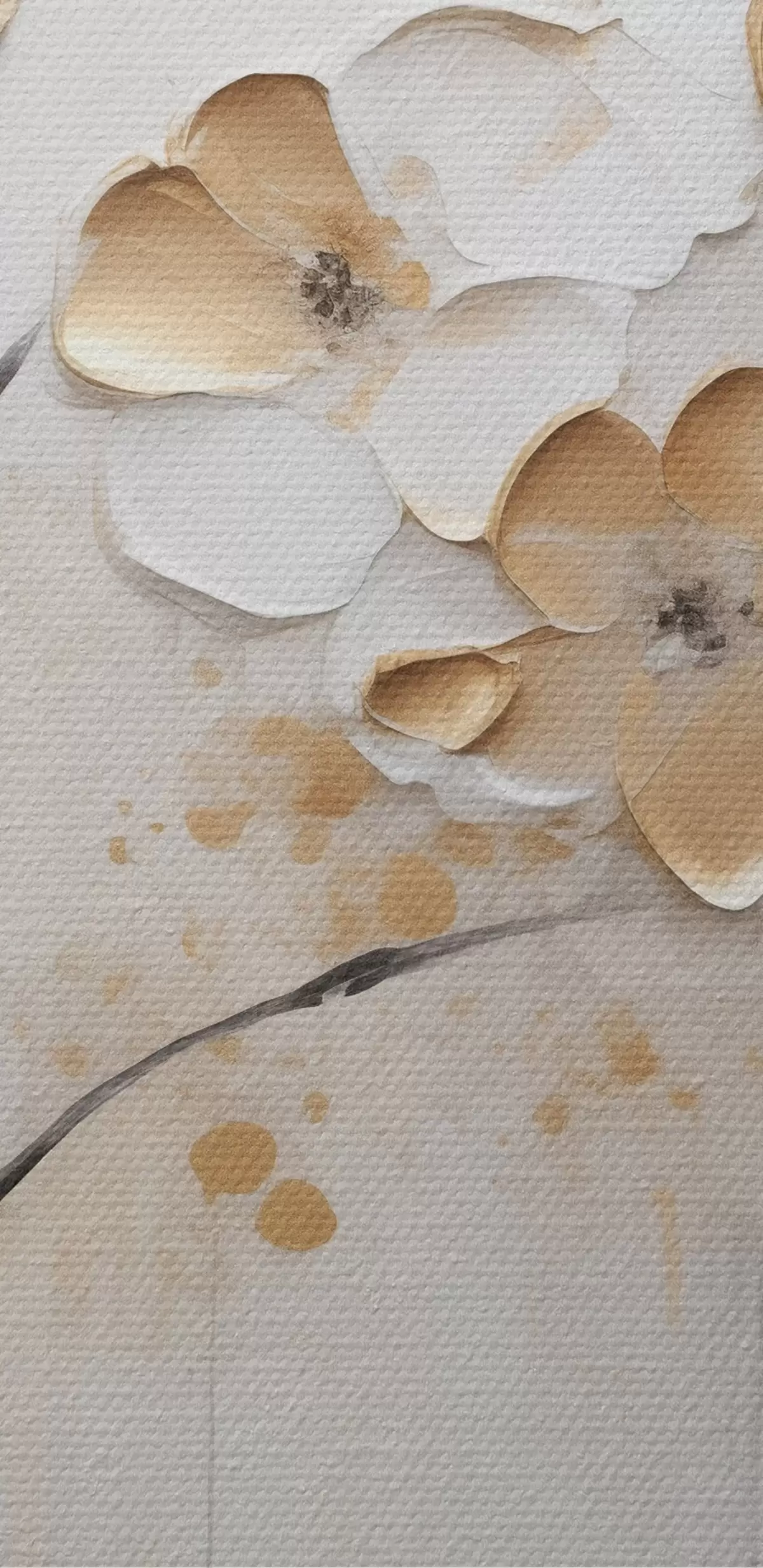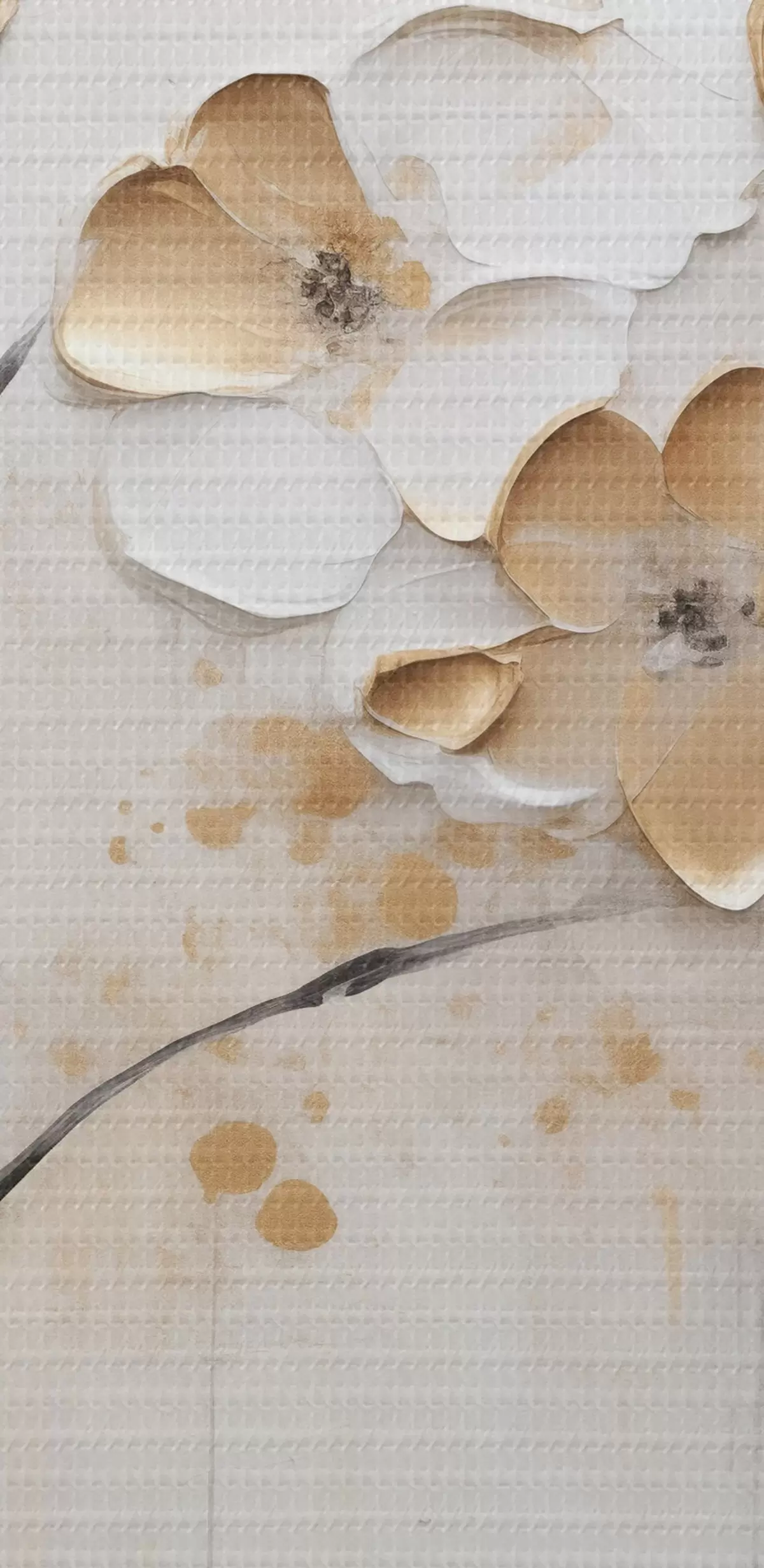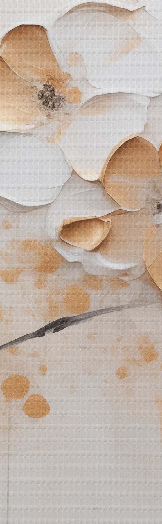 Okrągły obraz Kwiaty z teksturowanymi płatkami na miękkim, stonowanym tle z abstrakcyjnymi plamami koloru i pionowymi liniami Nr r42713