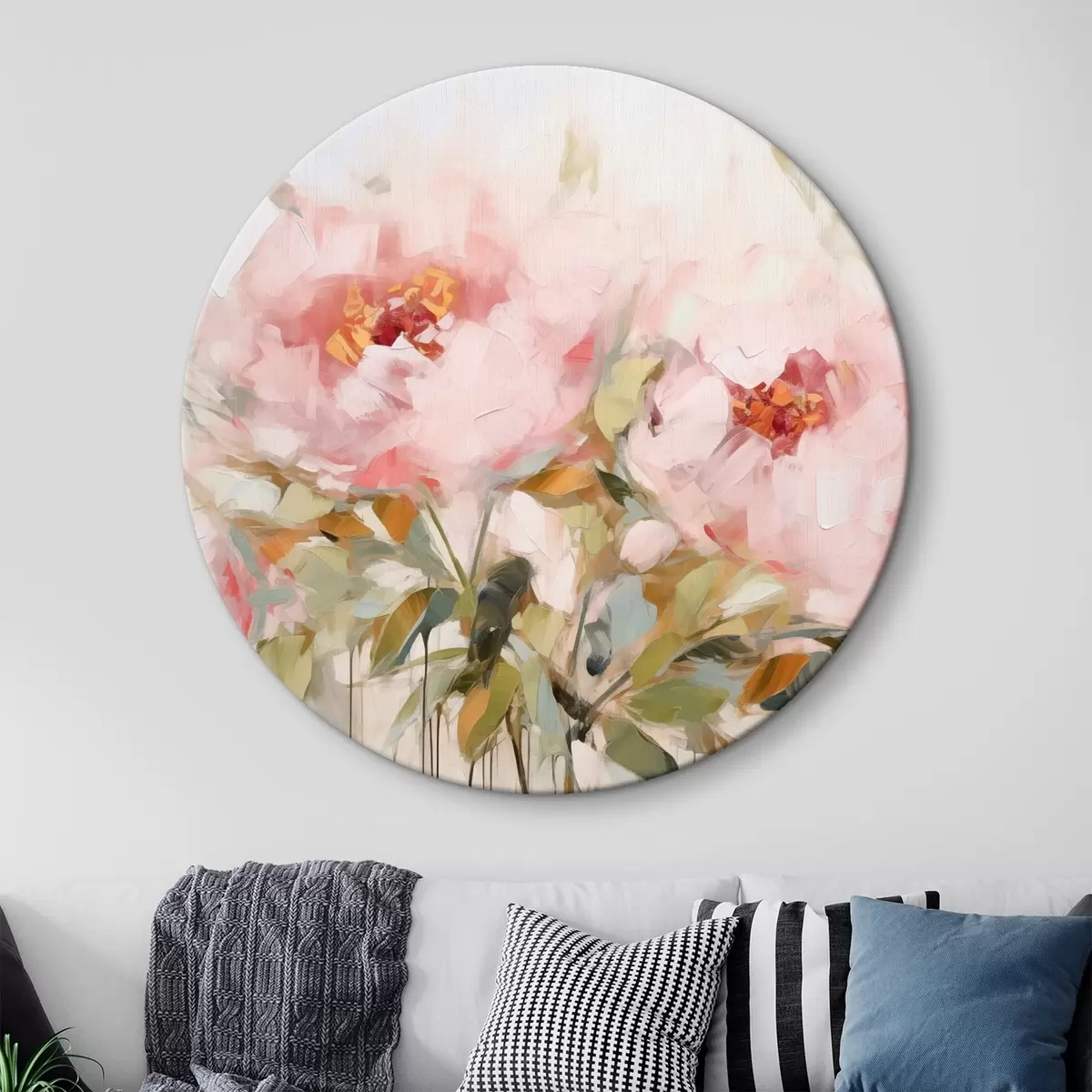 Okrągły obraz Obraz olejny imitujący duże różowe piwonie z miękkimi płatkami i żółtymi środkami, otoczone zielonymi liśćmi Nr r42720