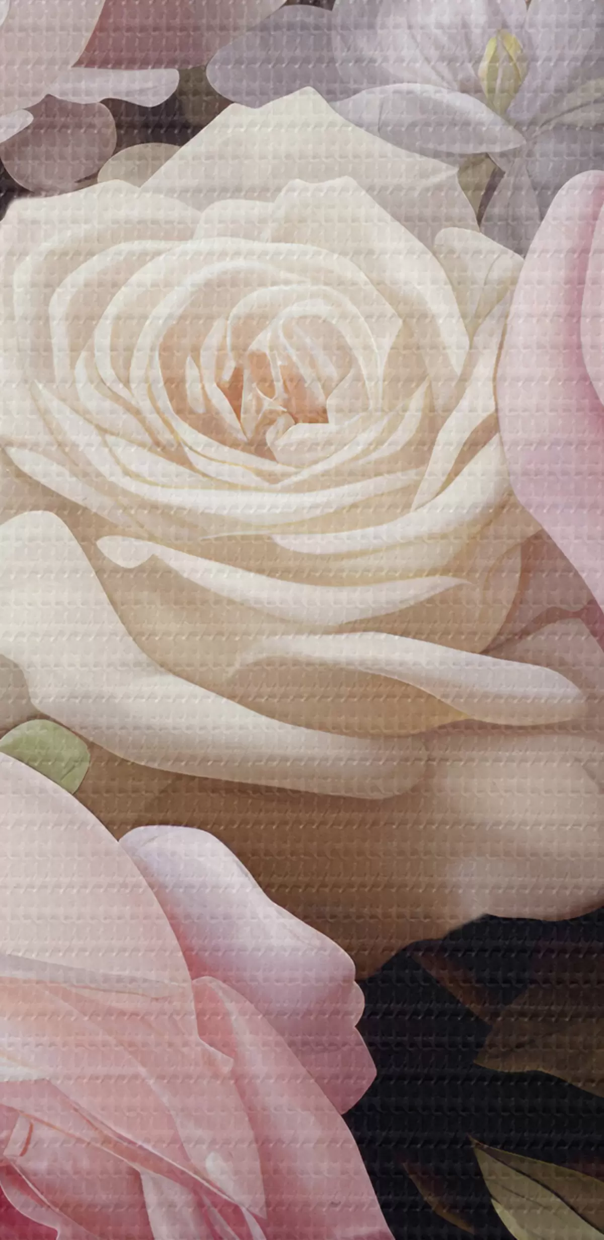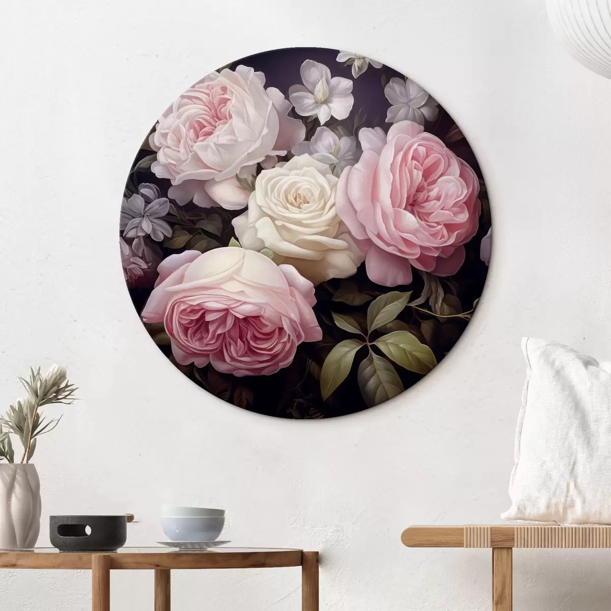 Okrągły obraz Różowe i białe róże ułożone z delikatnymi białymi kwiatami i zielonymi liśćmi na ciemnym tle Nr r42721