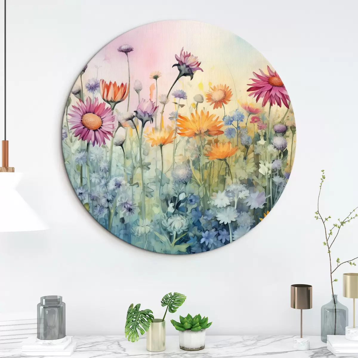 Okrągłe obrazy Tętniące życiem pole wysokich i bujnych polnych kwiatów na miękkim pastelowym tle przypominającym akwarelę r42726