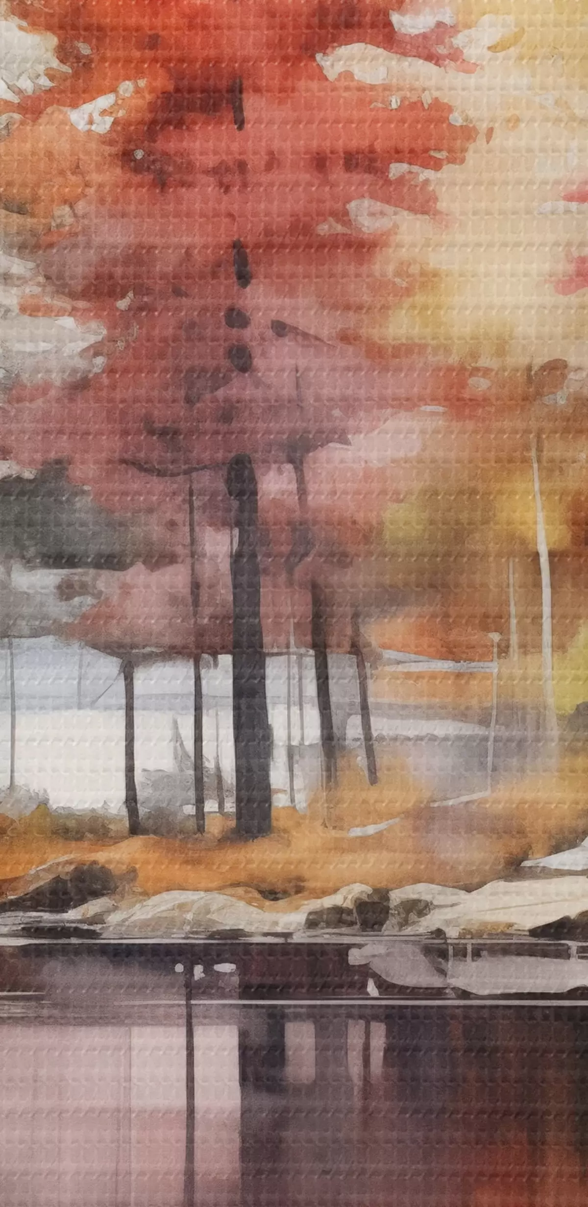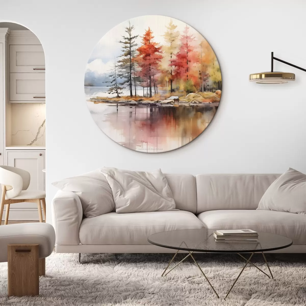 Okrągły obraz Akwarelowy krajobraz z jeziorem otoczonym drzewami w żywych jesiennych kolorach Nr r42727