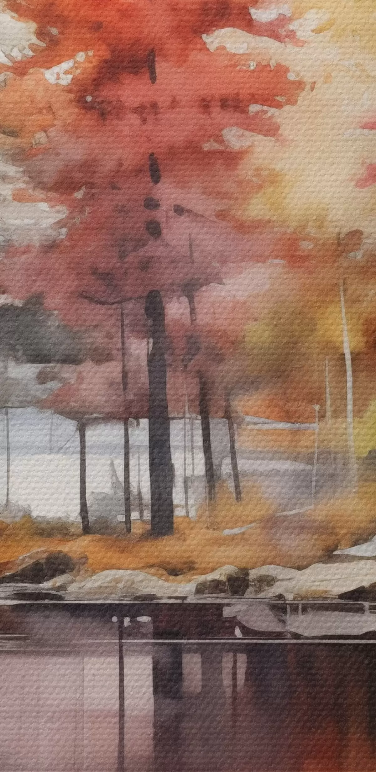 Okrągłe obrazy Akwarelowy krajobraz z jeziorem otoczonym drzewami w żywych jesiennych kolorach r42727