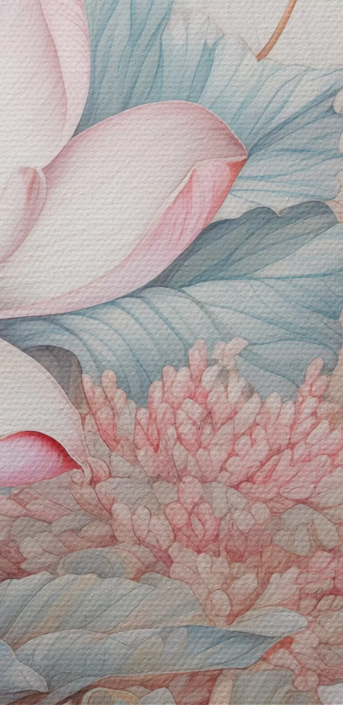 Okrągłe obrazy Duże, kwitnące kwiaty lotosu w delikatnych odcieniach różu i bieli, otoczone zielonymi liśćmi i delikatnymi różowymi listkami r42729