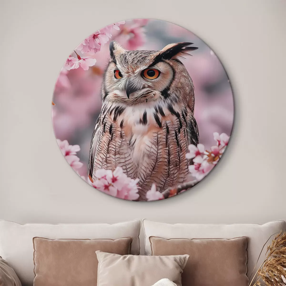 Okrągły obraz Piękna sowa na gałęzi wiśni, natura, realizm Nr r42784