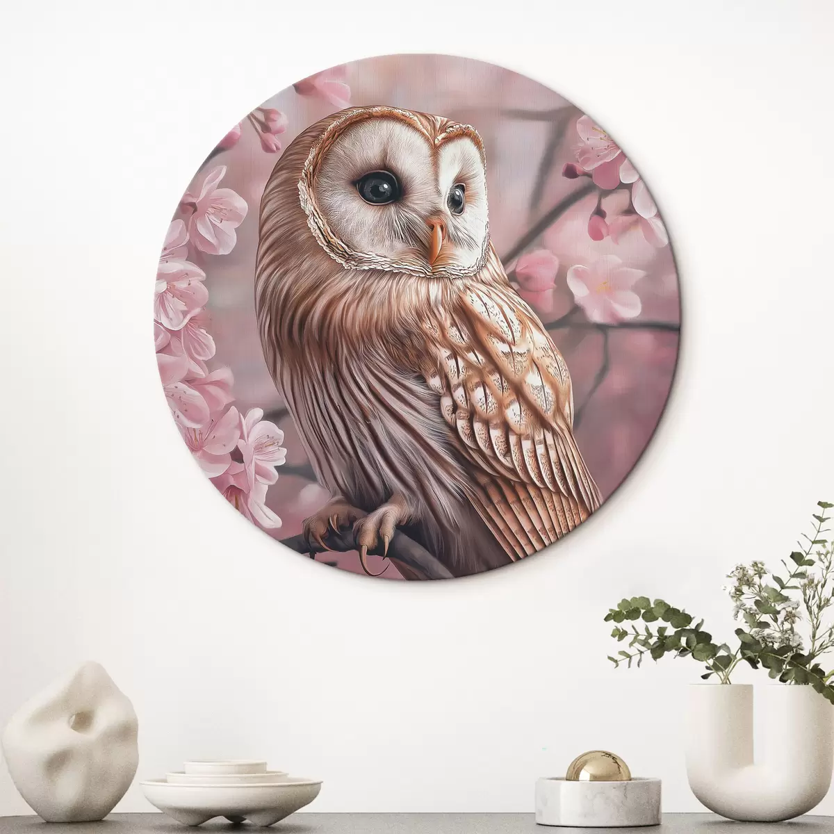 Okrągłe obrazy Sowa na wiśni, różowe kwiaty, realizm, natura r42785