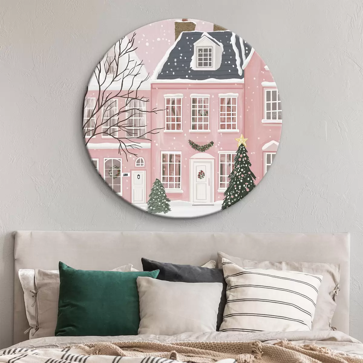 Okrągły obraz Urocze różowe domy, sosny, zimowe krajobrazy Nr r42791