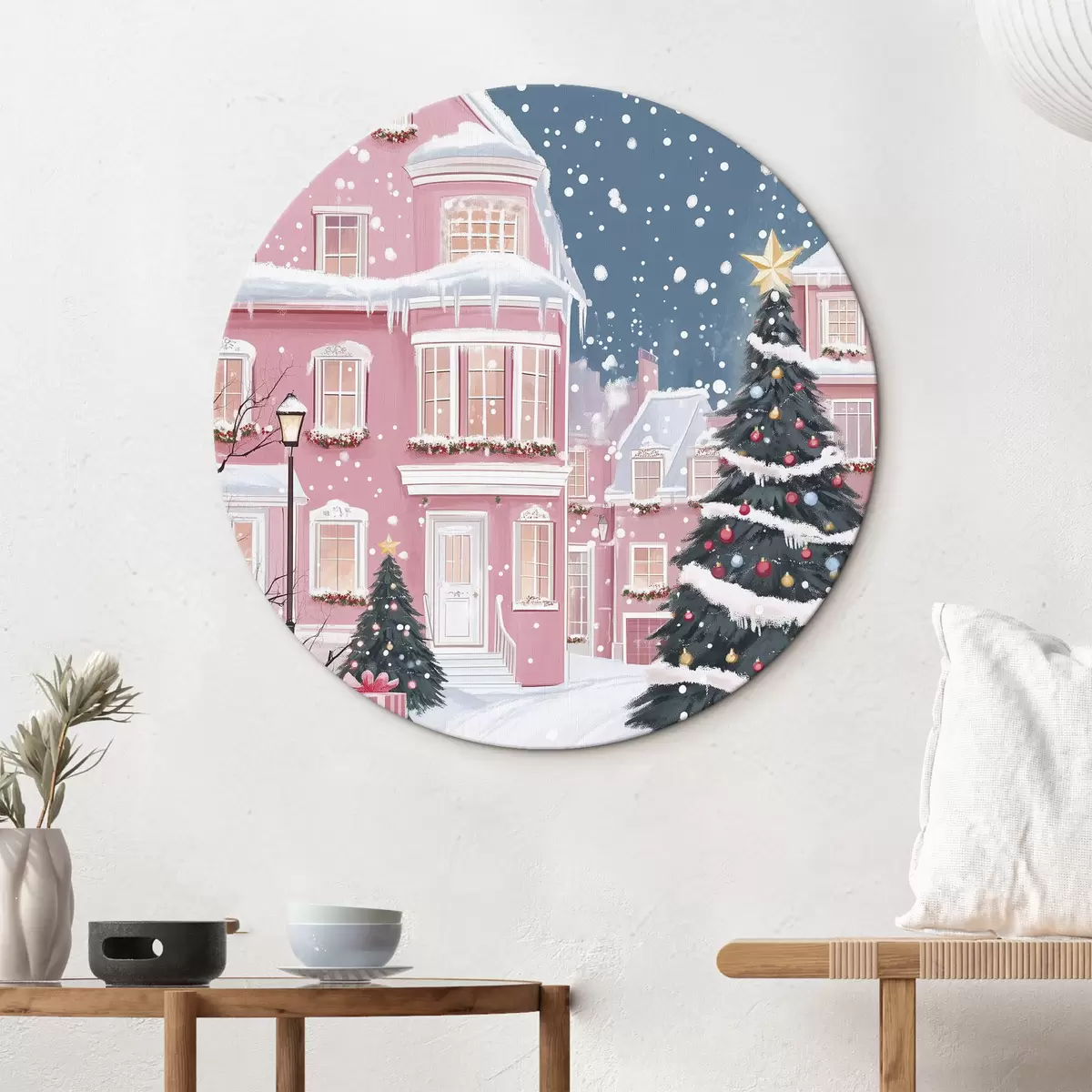 Okrągłe obrazy Zimowe miasto z różowymi domami, choinkami i płatkami śniegu r42792