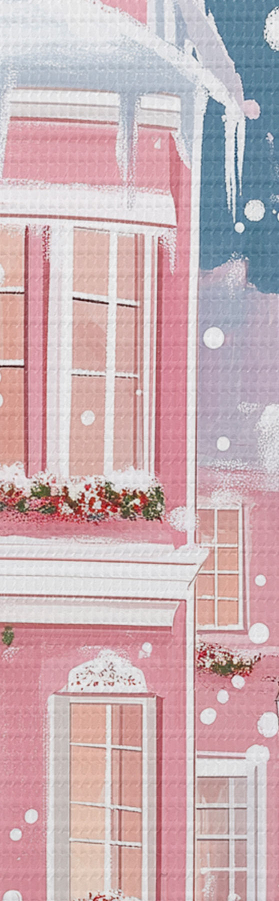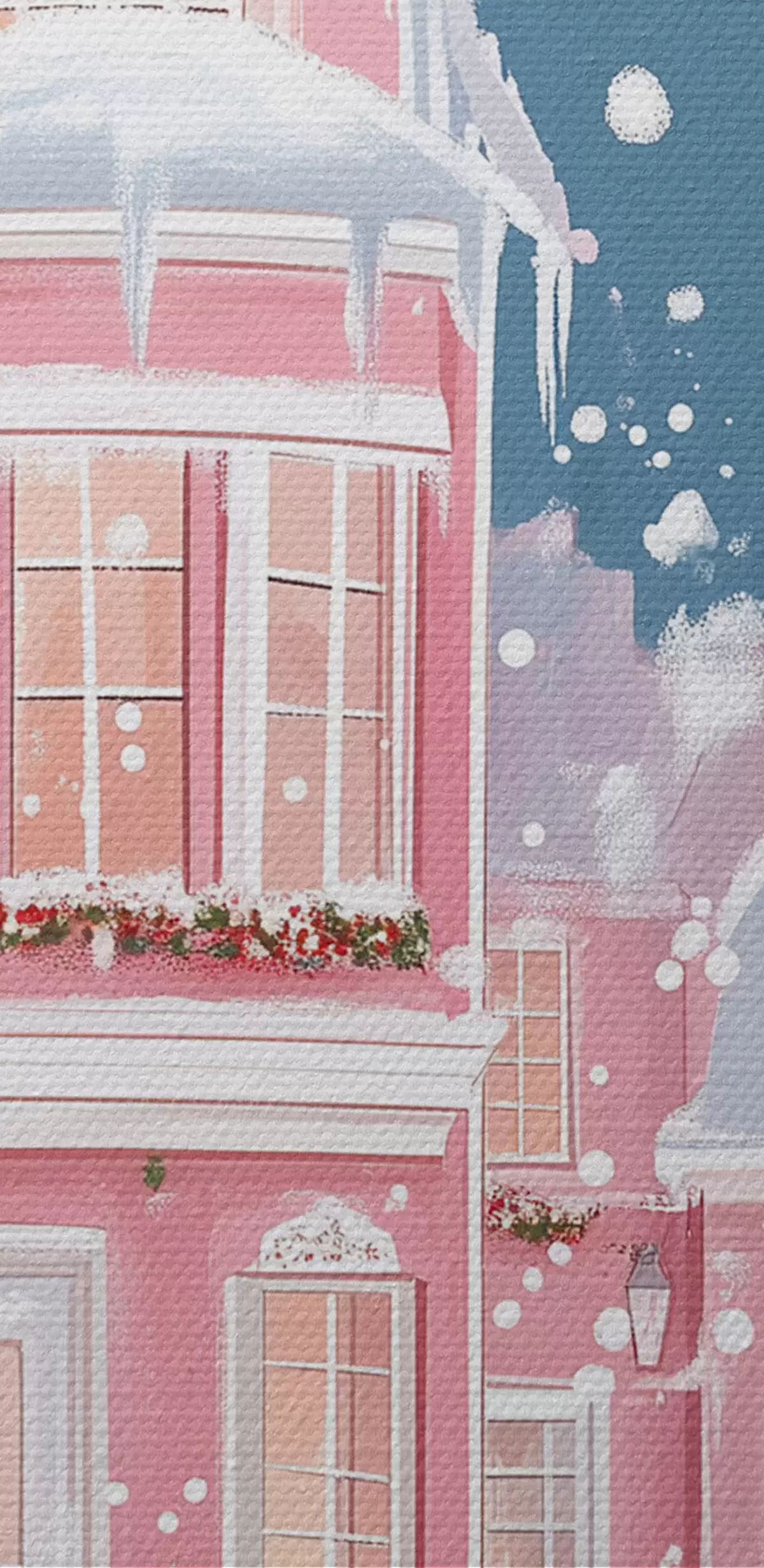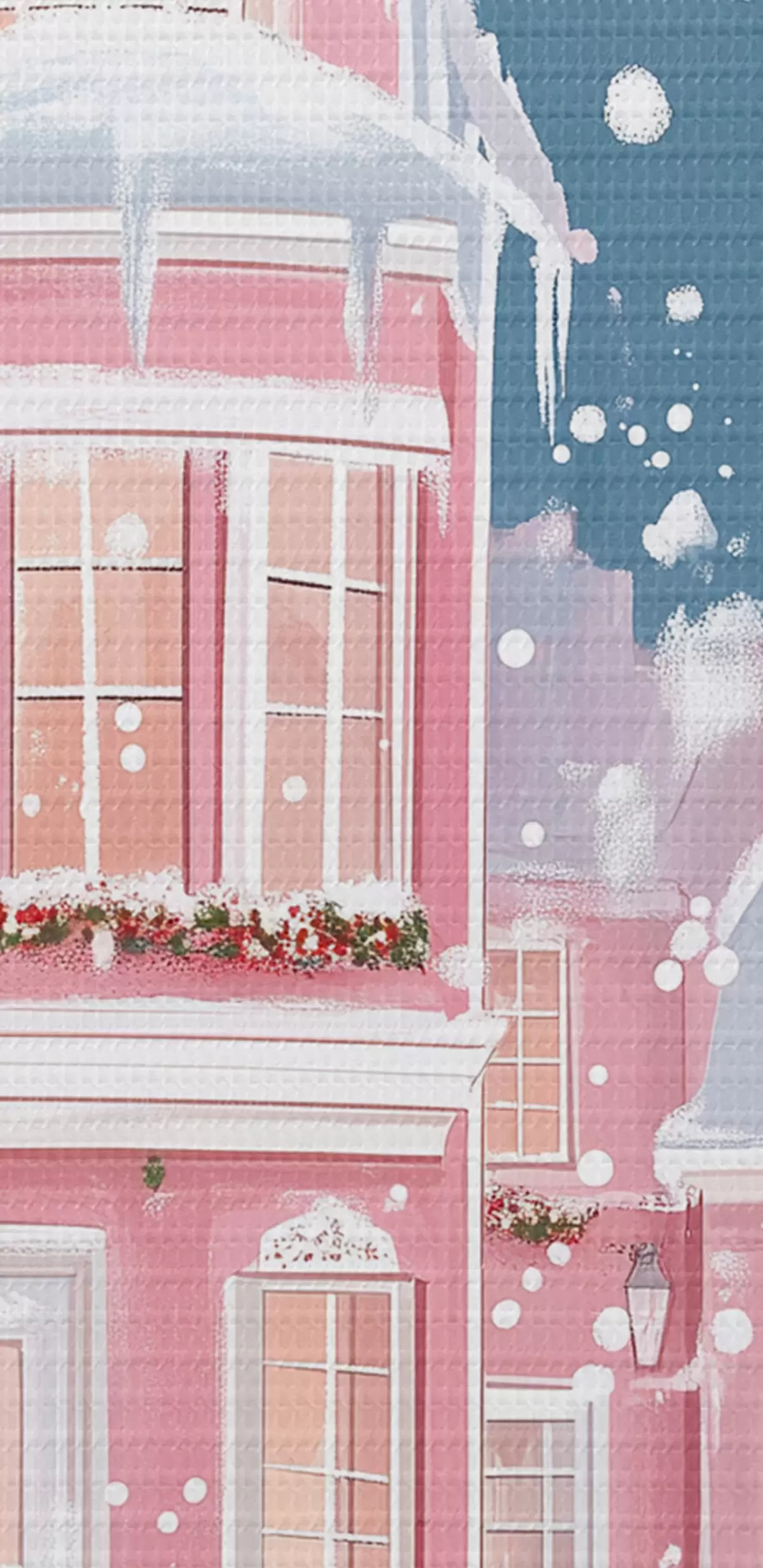 Okrągły obraz Zimowe miasto z różowymi domami, choinkami i płatkami śniegu Nr r42792