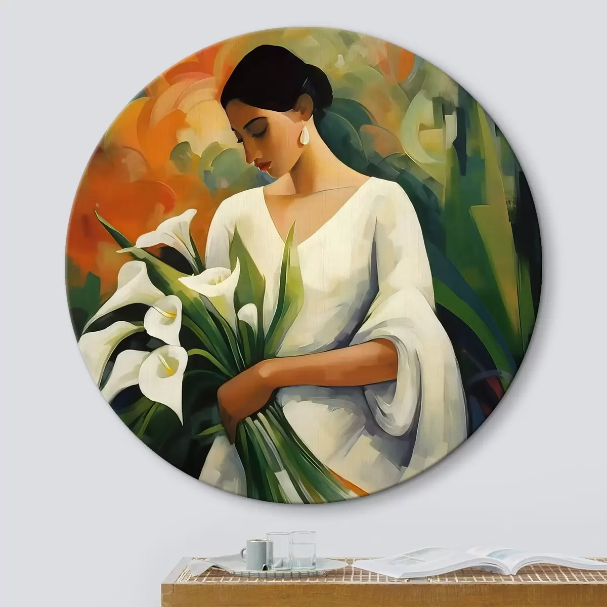 Okrągły obraz Kobieta z bukietem lilii kalii Nr r42818