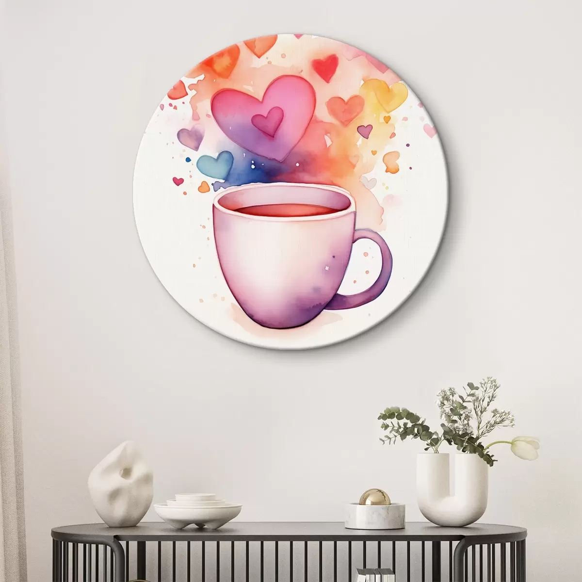 Okrągły obraz Filiżanka na tle akwarelowych serc Nr r42869
