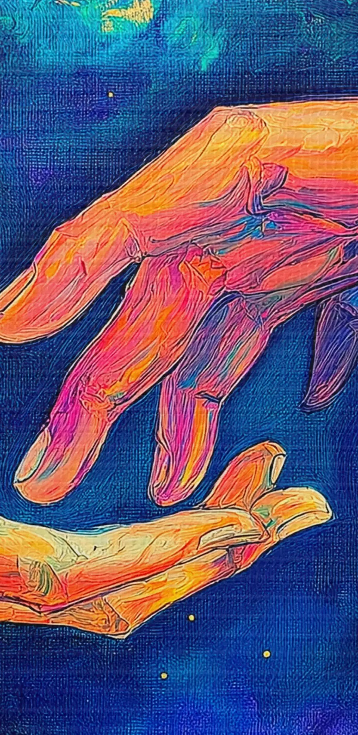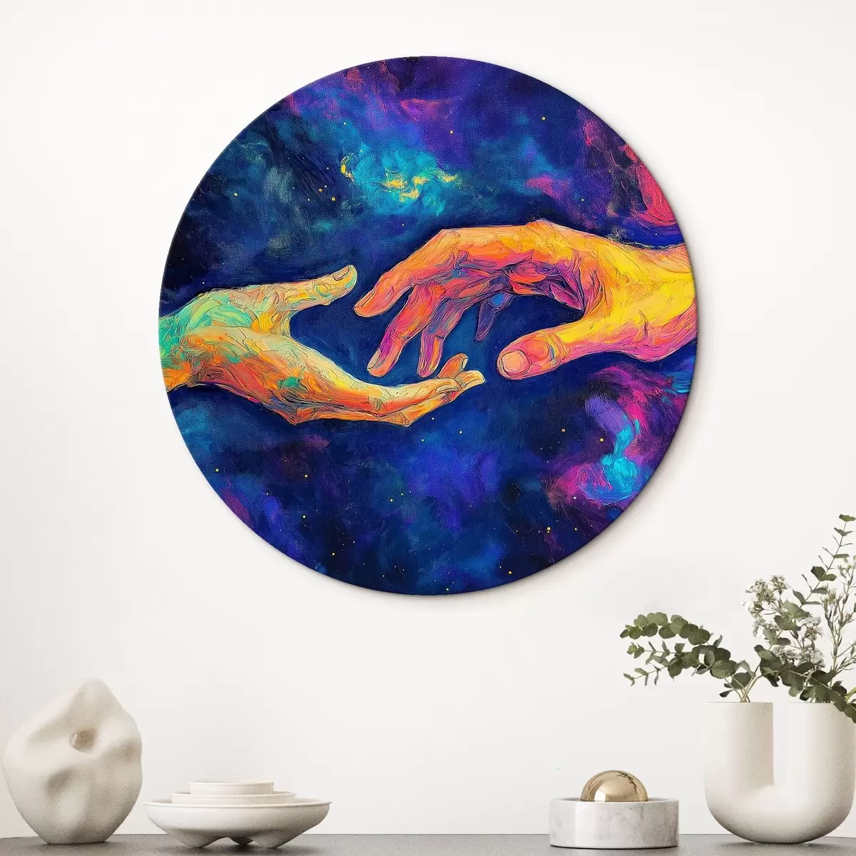 Okrągłe obrazy Abstrakcyjna kompozycja dwóch dłoni sięgających do siebie, w żywej palecie kolorów na kosmicznym tle r42937