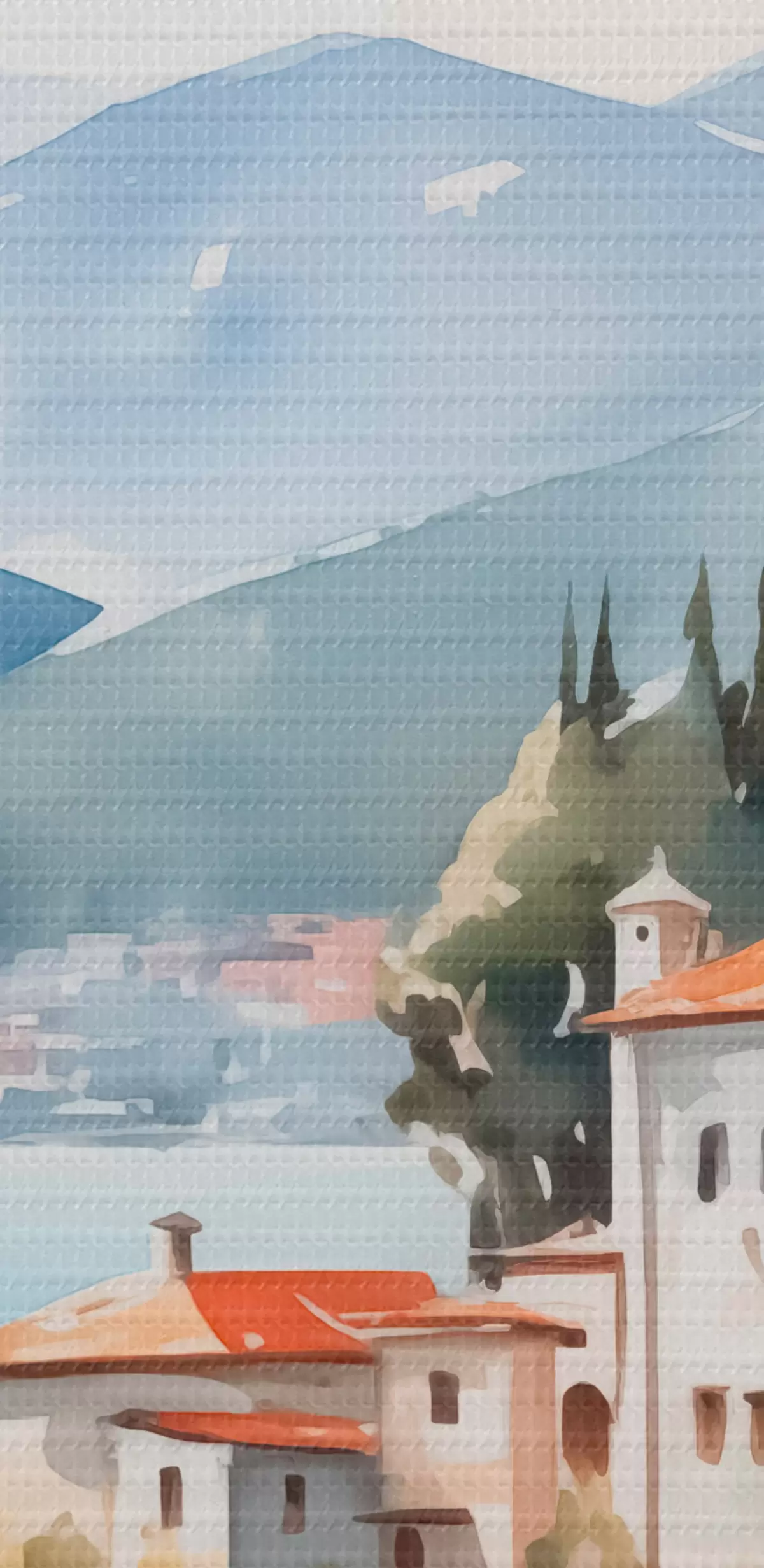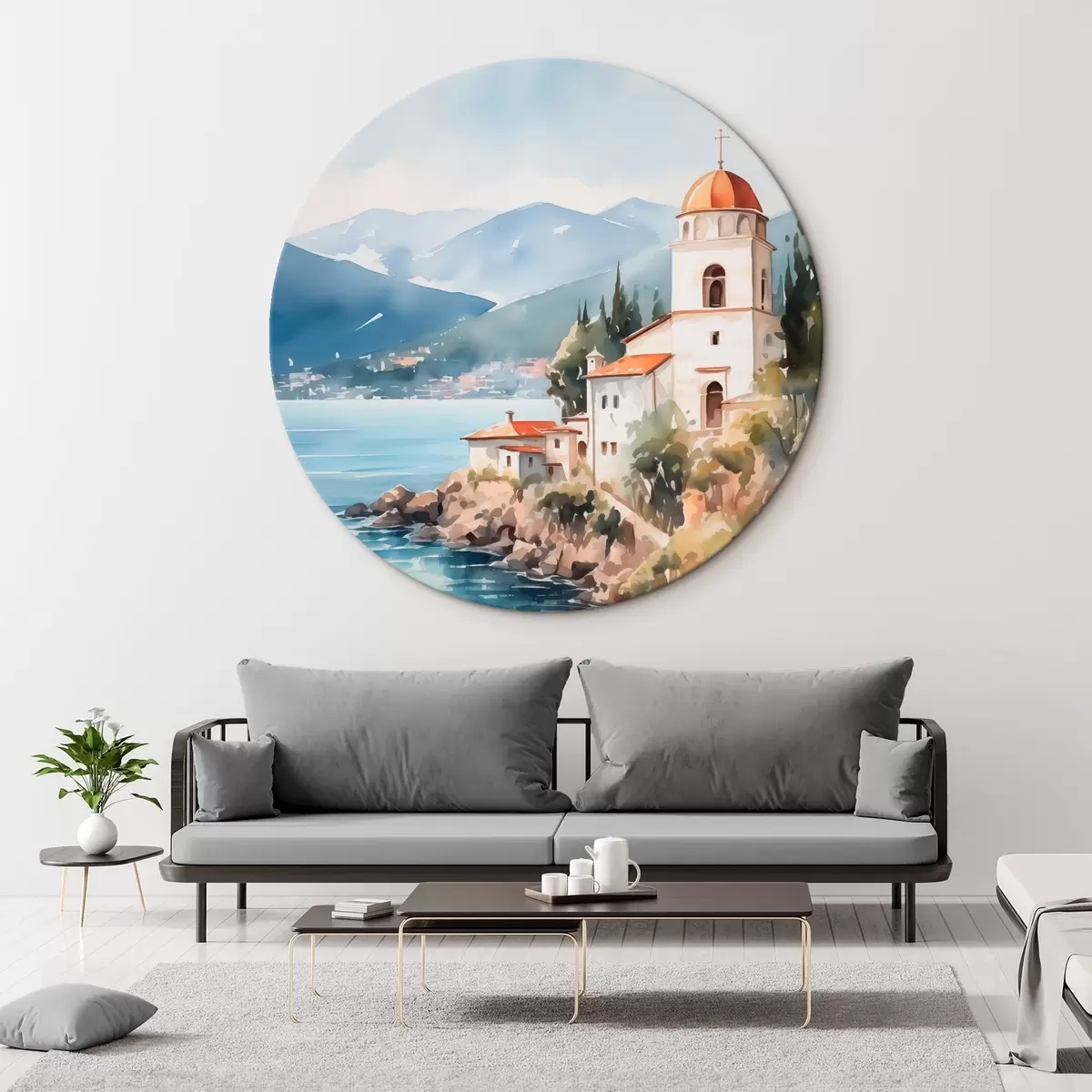 Okrągły obraz Kościół nad morzem z górami w tle Nr r42962
