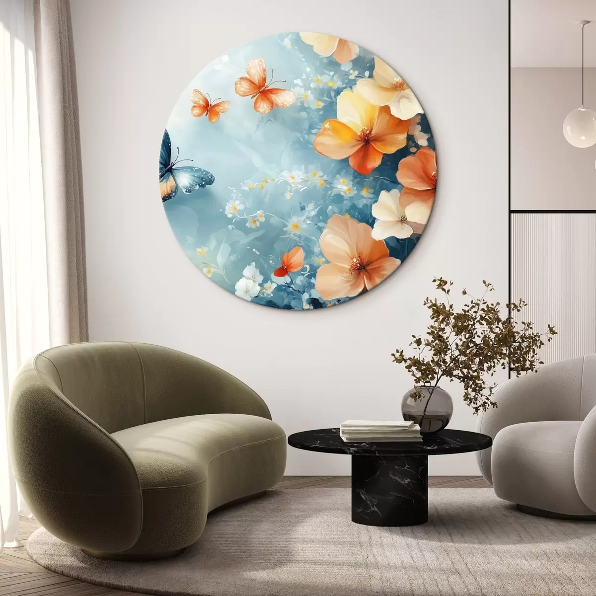Okrągłe obrazy Pomarańczowe kwiaty i motyle r42974