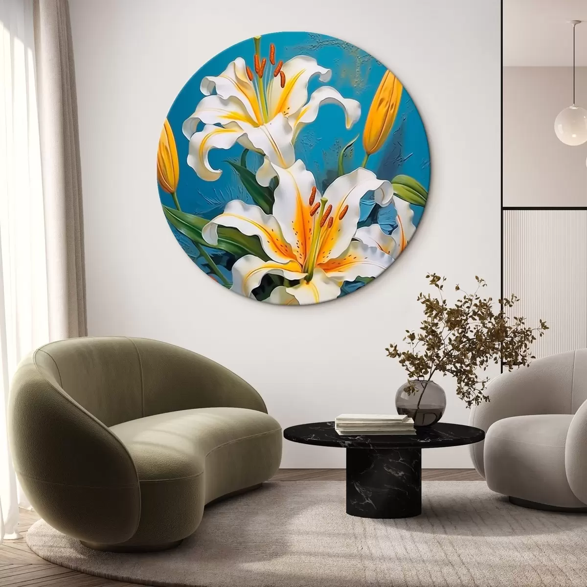 Okrągły obraz Białe lilie na niebieskim tle Nr r43018