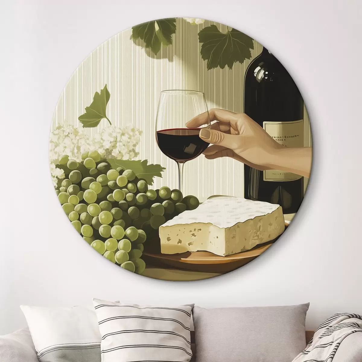 Okrągłe obrazy Winogrona z serem, butelka wina, styl vintage, białe kwiaty r43052