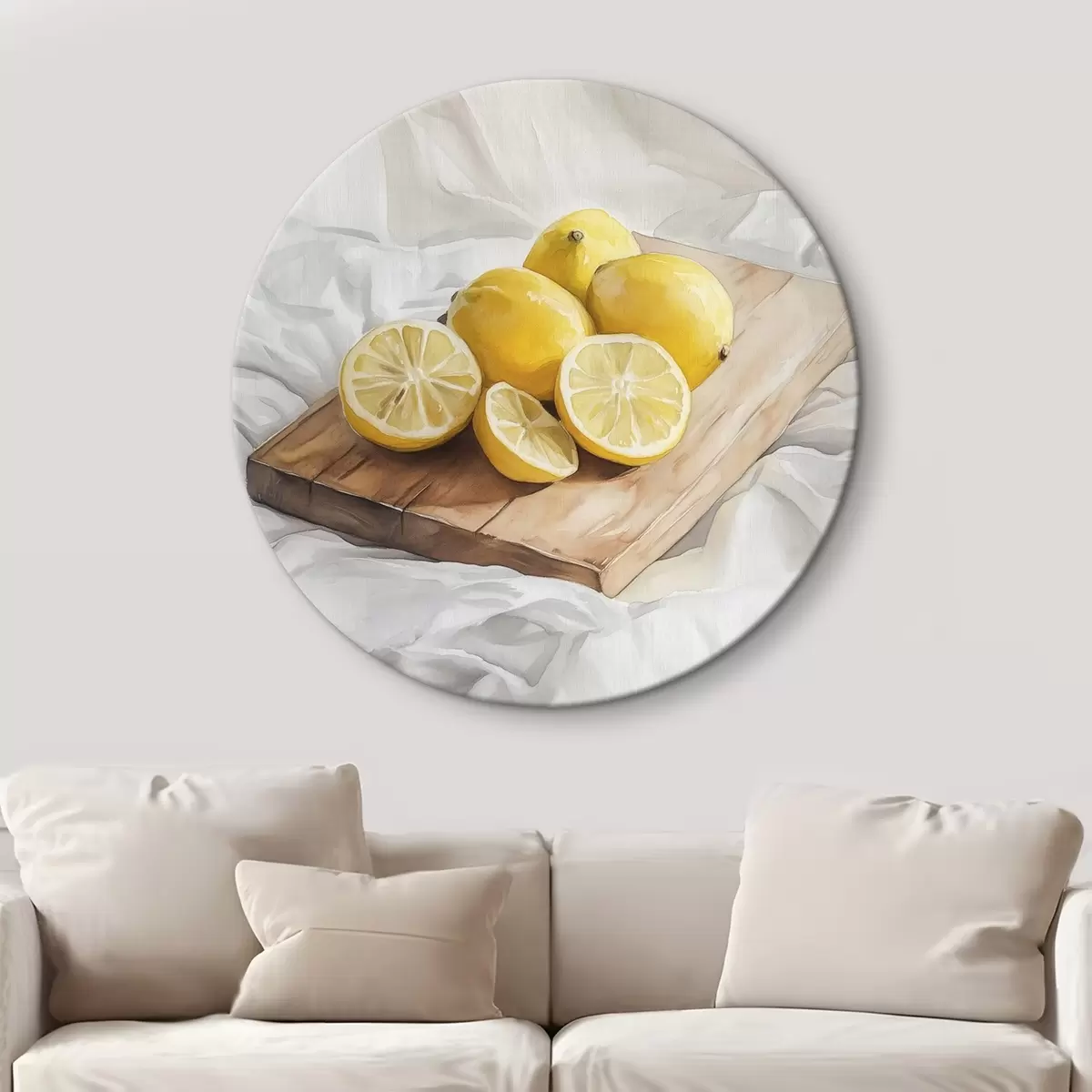 Okrągły obraz Estetyczne cytryny na drewnianej desce, dekoracja domu, naturalne oświetlenie Nr r43062