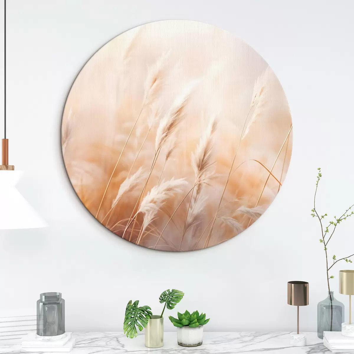 Okrągły obraz Trawa pampasowa z miękkim, rozproszonym światłem, tworzącym ciepłe, tło jest mieszanką pastelowych kolorów Nr r43157