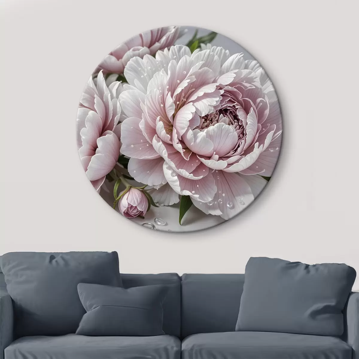 Okrągłe obrazy Jasnoróżowe i białe piwonie z kroplami wody na płatkach, tło to biała powierzchnia r43158