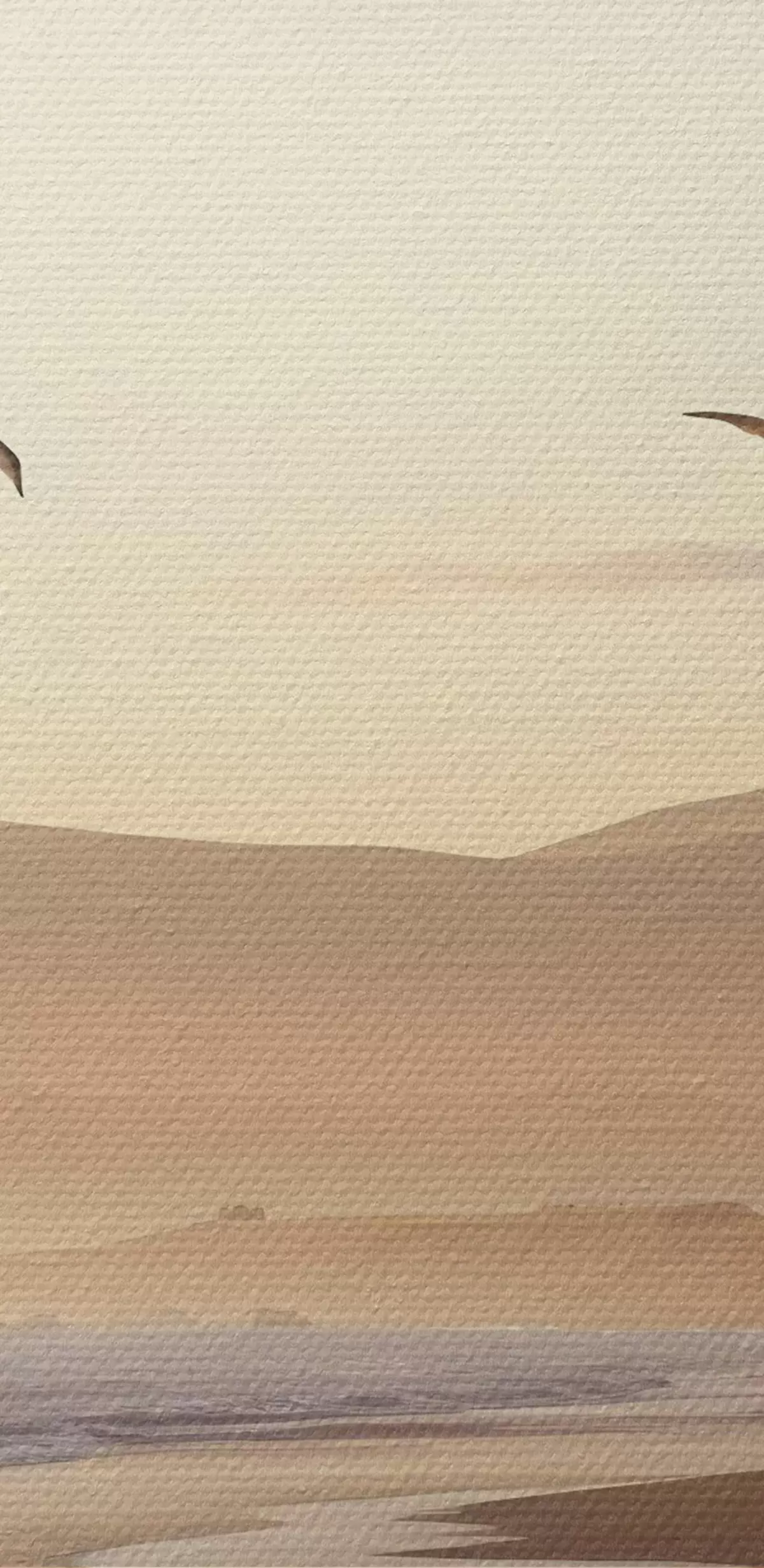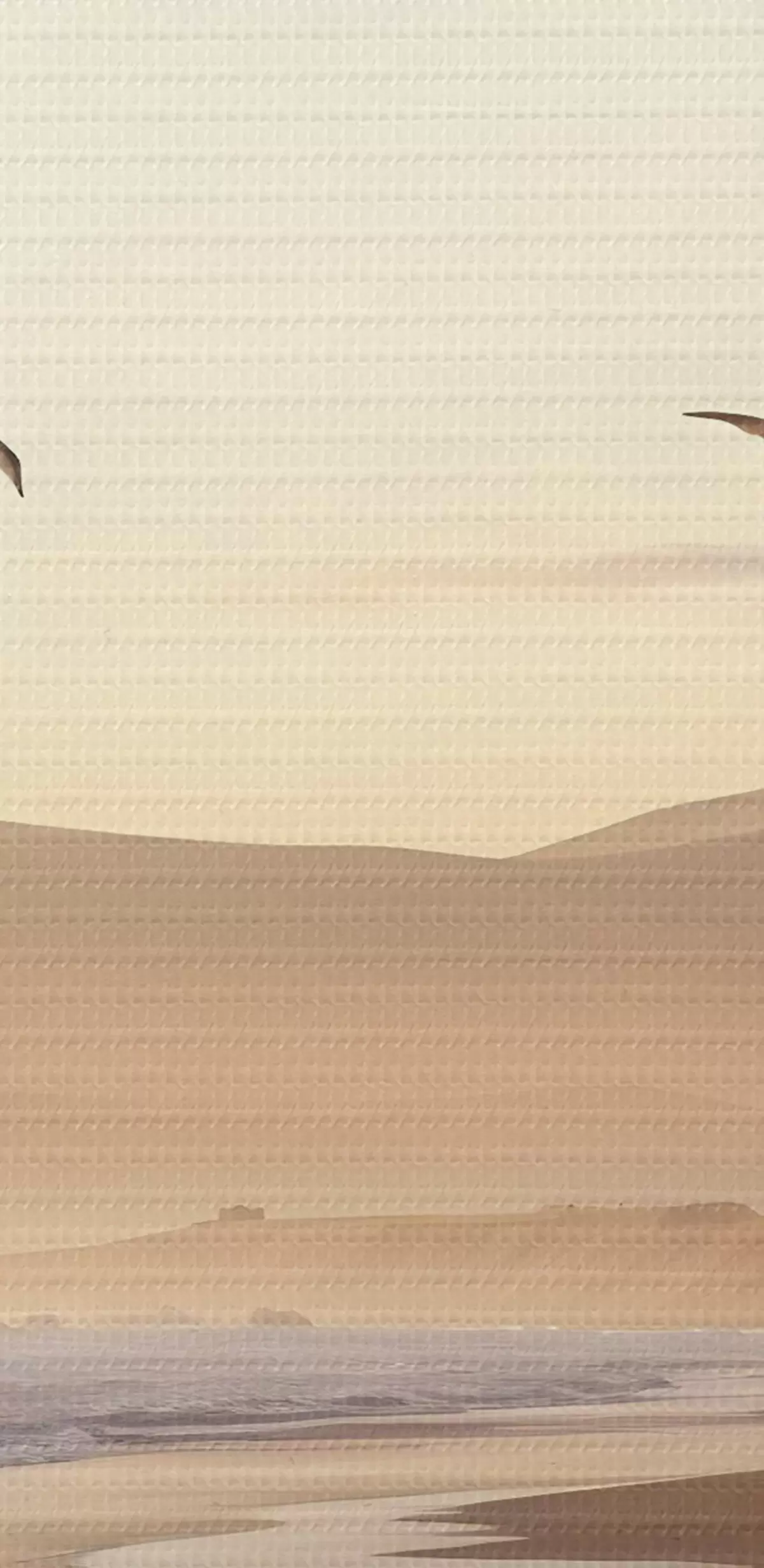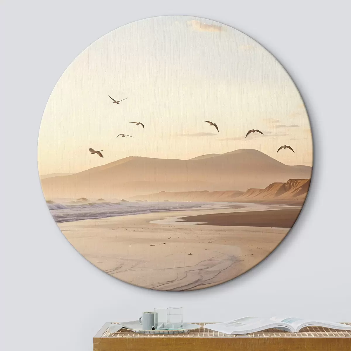 Okrągłe obrazy Ptaki latające nad plażą z oceanem, góry w tle, ciepłe kolory, miękka pastelowa paleta r43162