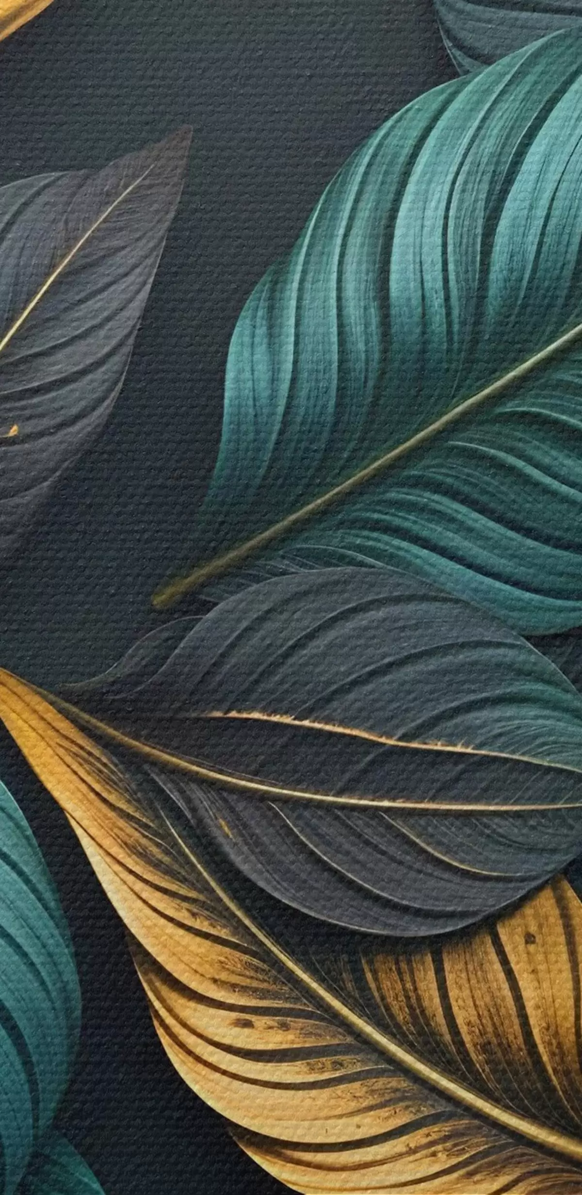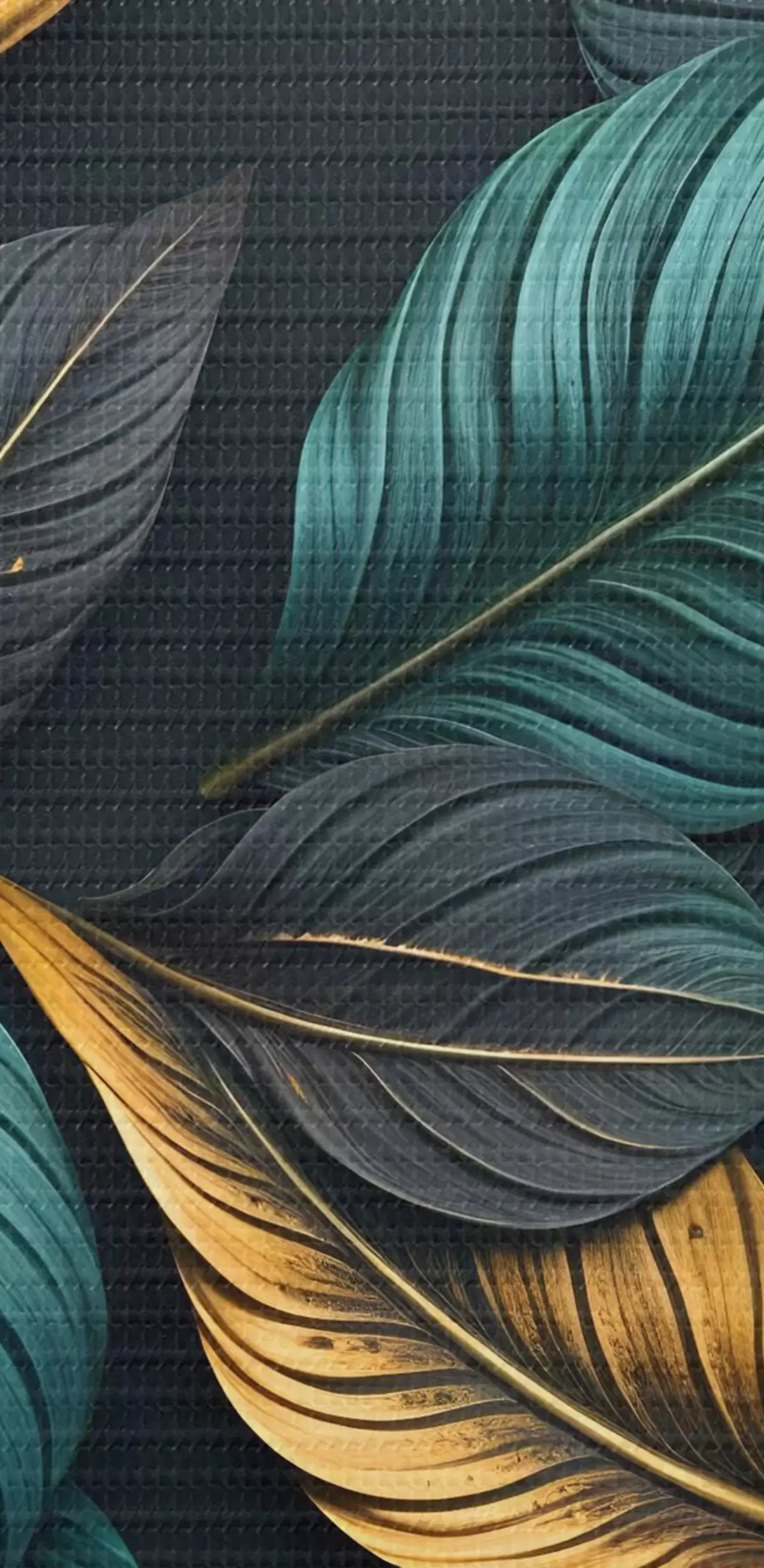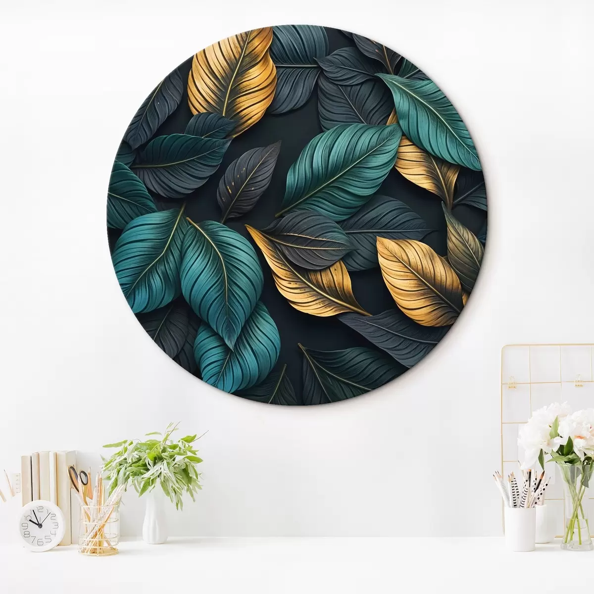 Okrągły obraz Ciemnozielone, żółte i czarne liście z ciemnymi żyłkami, na ciemnym tle, elegancki tropikalny klimat Nr r43164
