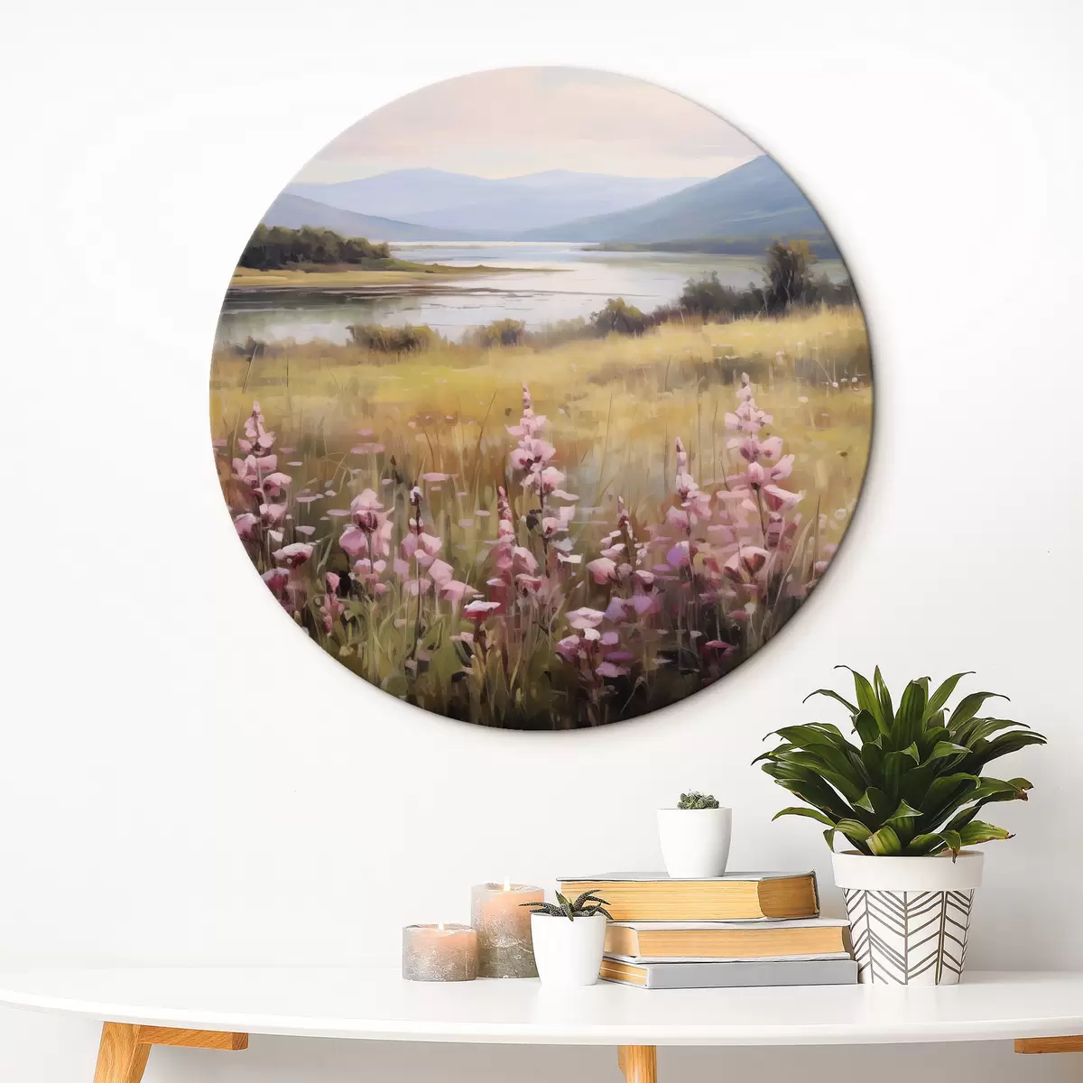 Okrągłe obrazy Krajobraz z polem różowych kwiatów, jeziorem i górami w tle, pod zachmurzonym niebem r43165