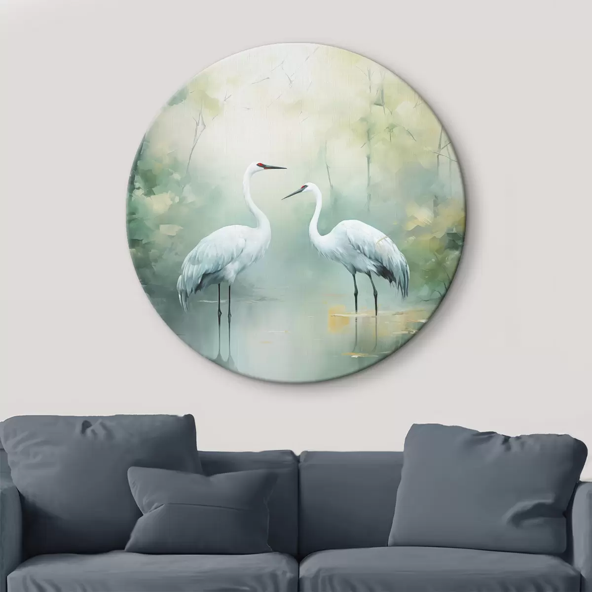 Okrągłe obrazy Dwa białe żurawie stojące w stawie, otoczone bujnym zielonym lasem z miękkim, rozproszonym oświetleniem r43166