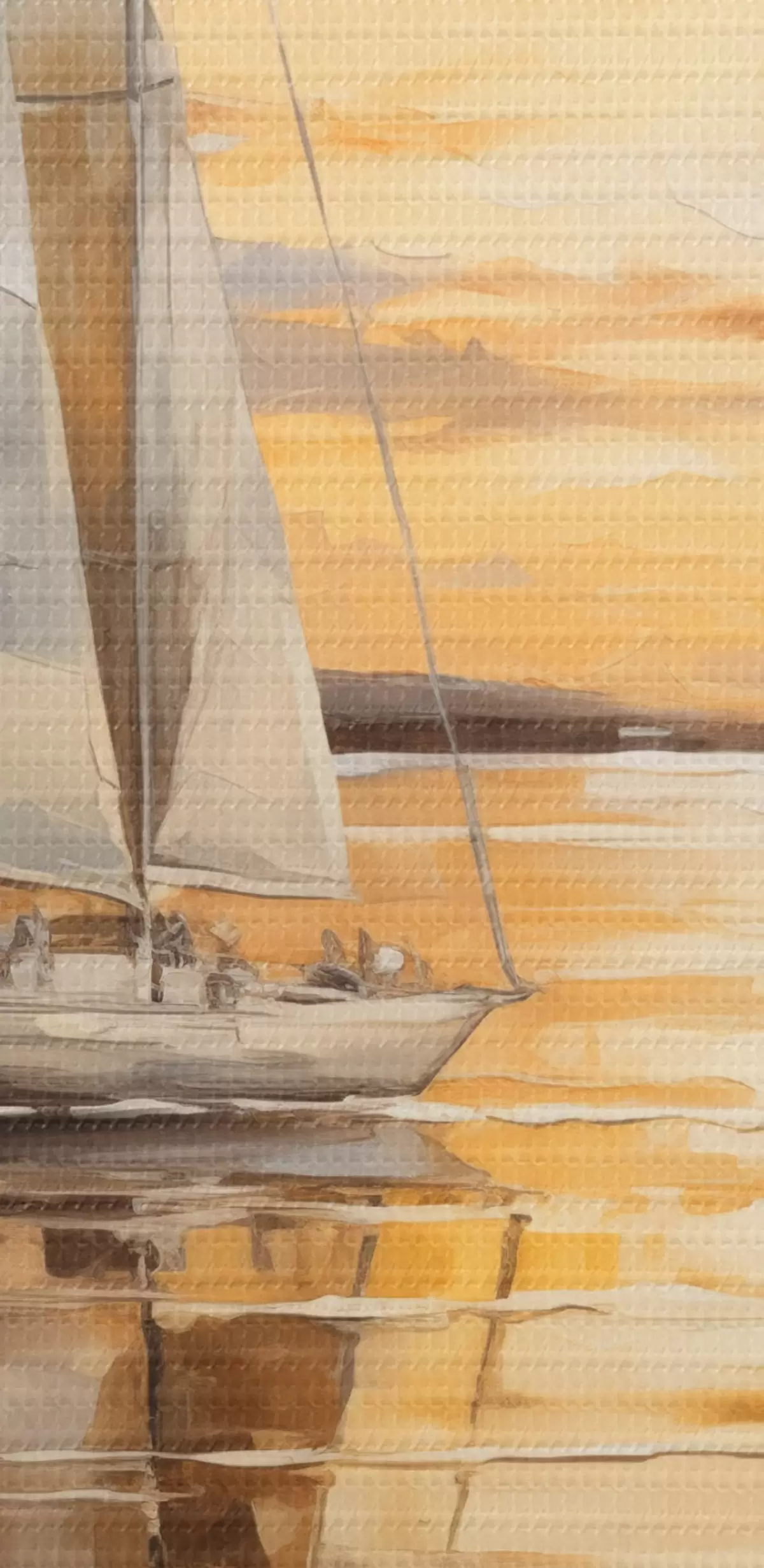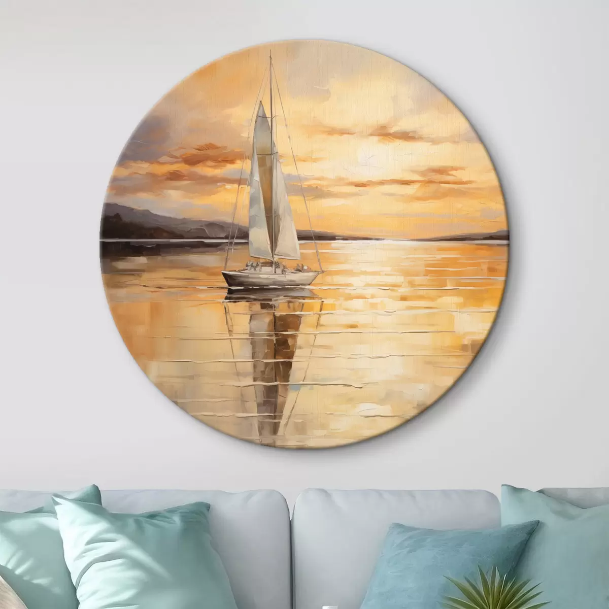 Okrągły obraz Obraz krajobrazowy z żaglówką na spokojnym morzu, pomarańczowo-żółte niebo, odległe góry Nr r43169