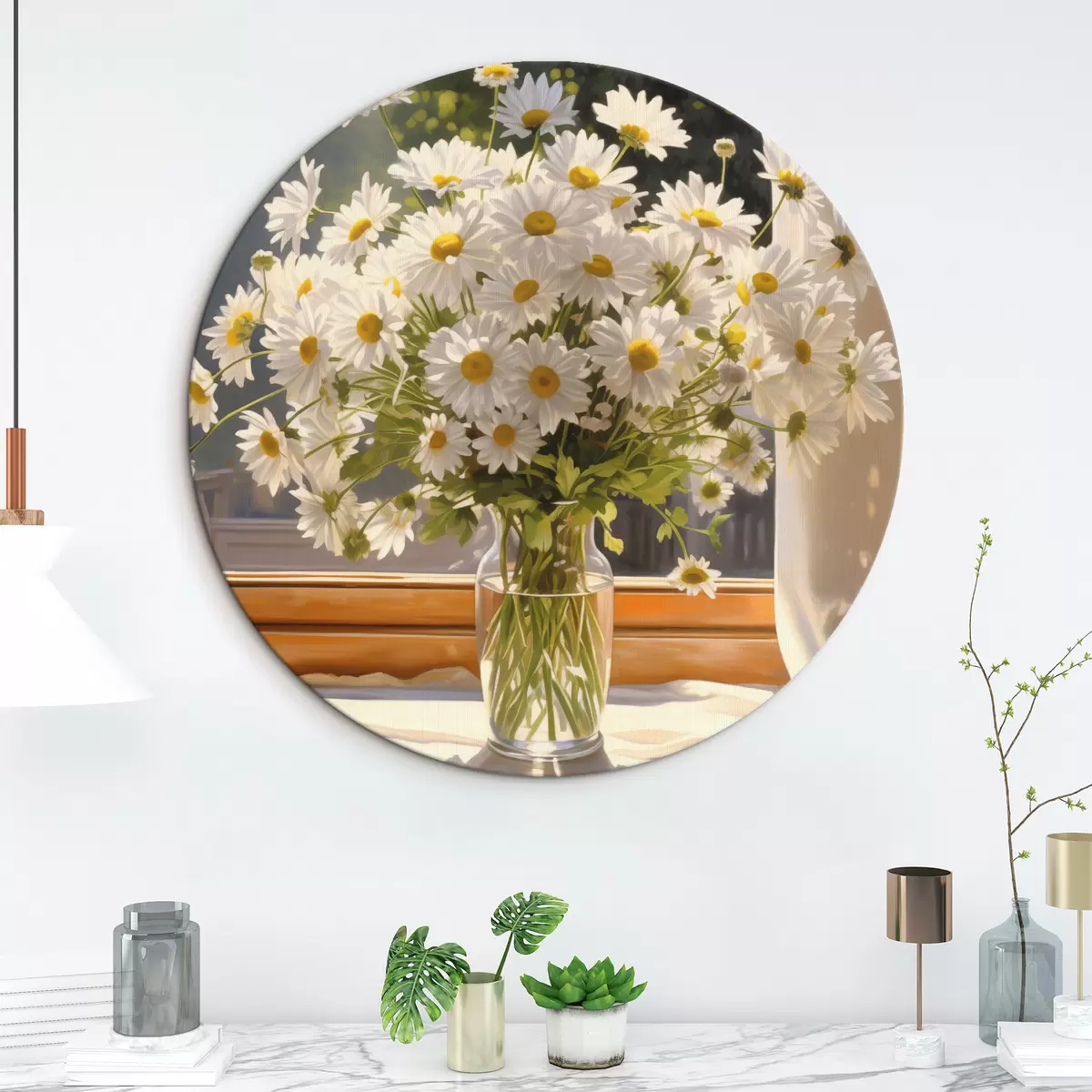 Okrągły obraz Obraz olejny imitujący wazon z białymi stokrotkami na parapecie, słoneczny dzień, ciepła paleta kolorów Nr r43171