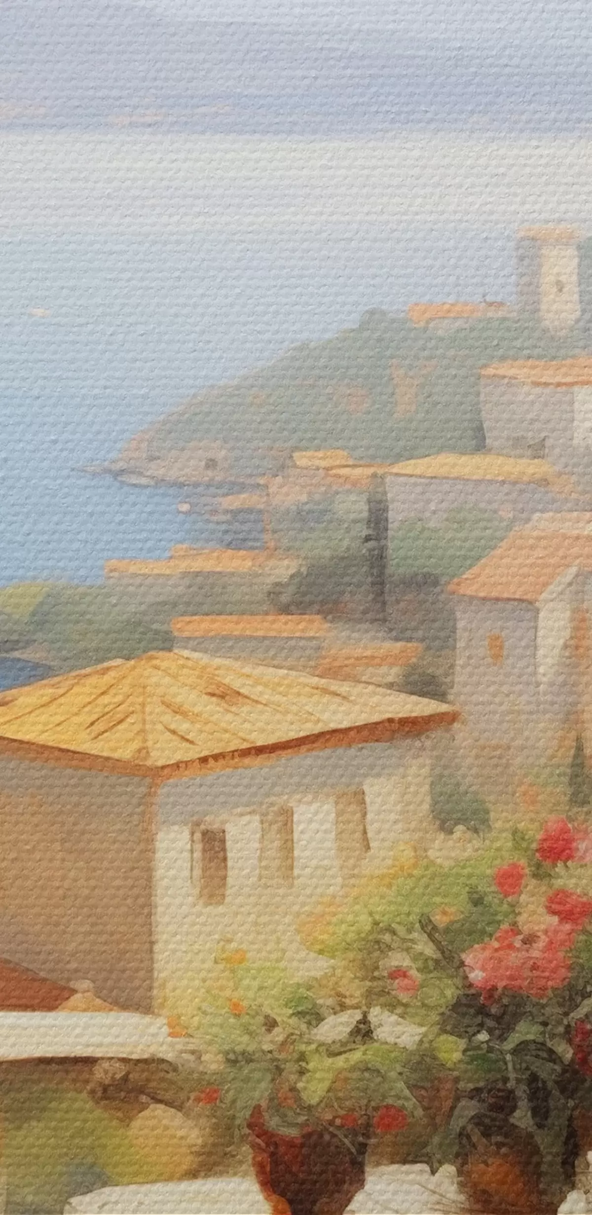 Okrągły obraz Obraz olejny imitacja balkonu z kwiatami, z widokiem na morze, domy na wybrzeżu, słoneczny dzień, błękitne niebo Nr r43173