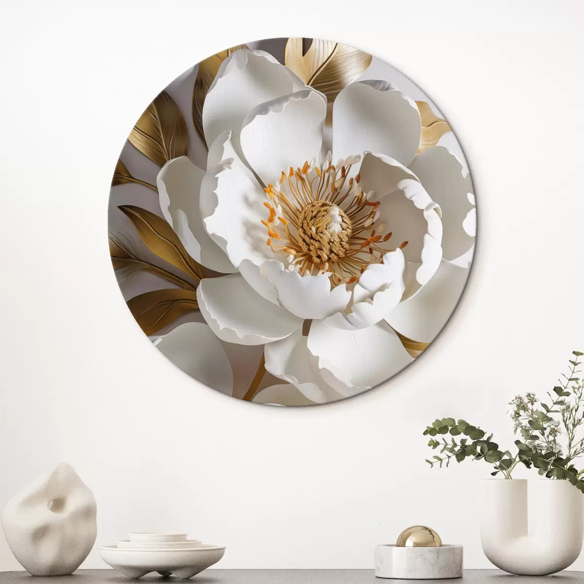 Okrągły obraz Białe delikatne, szczegółowe dekoracyjne kwiaty piwonii z żółtymi liśćmi, tło w kolorze jasnoszarym Nr r43176