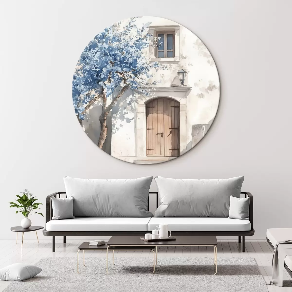 Okrągły obraz Grecki dom z pięknym drzewem, architektura, styl akwareli Nr r43178