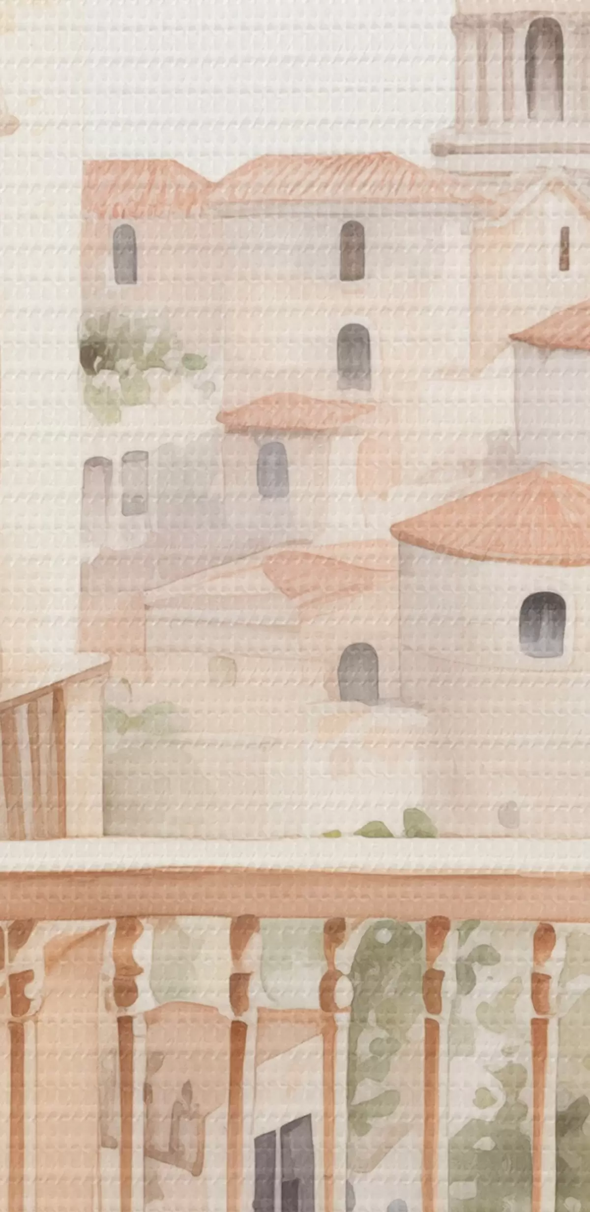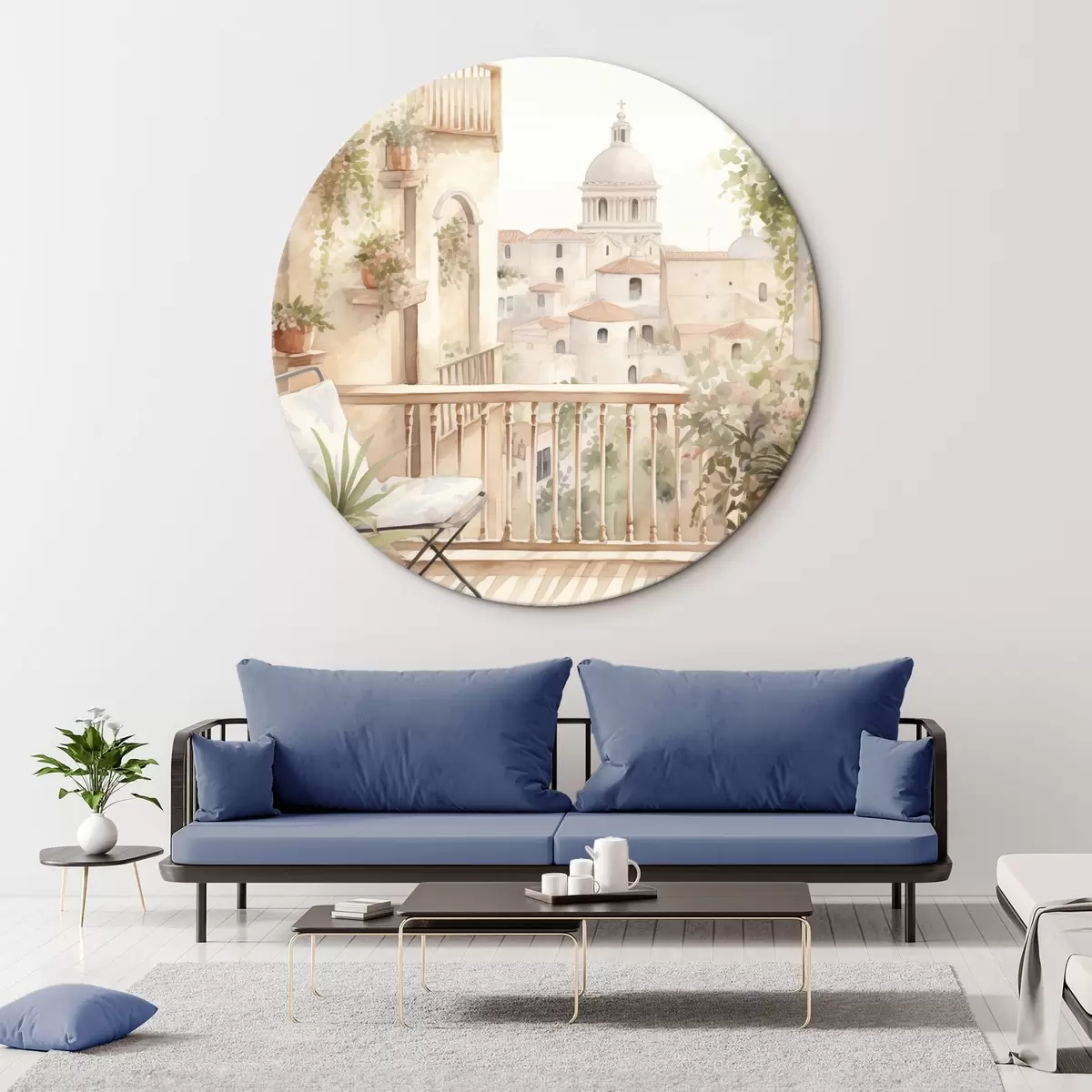 Okrągłe obrazy Estetyczny letni balkon, Hiszpania, stara architektura, blomming, styl akwareli r43180