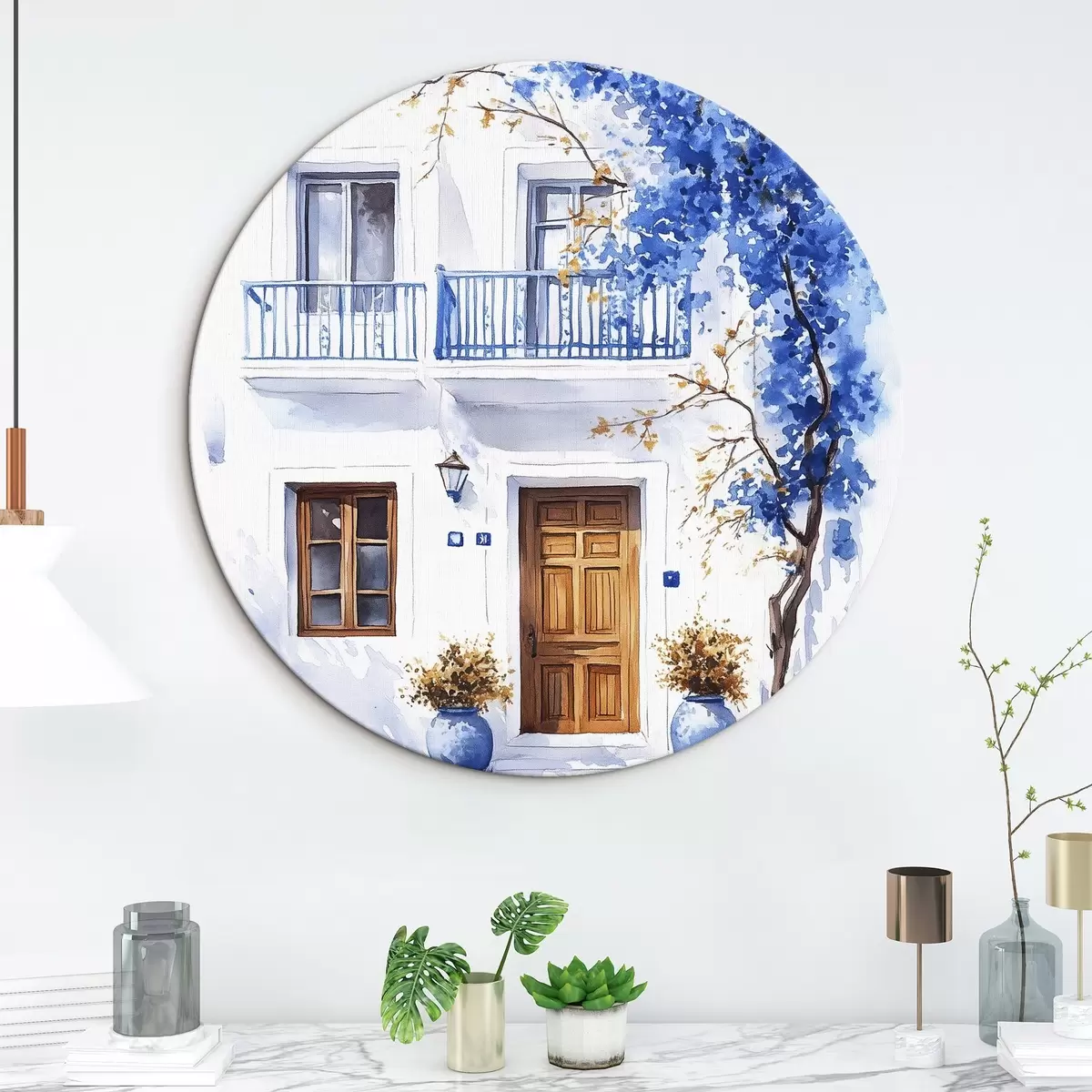 Okrągłe obrazy Kwitnące drzewo z niebieskimi kwiatami, biały dom, Grecja, styl akwareli r43183
